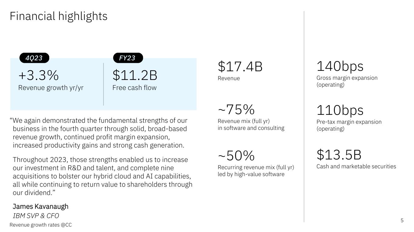 “In the fourth quarter, we grew revenue in all of our segments, driven by continued adoption of our hybrid cloud and AI offerings. Client demand for AI is accelerating and our book of business for watsonx and generative AI roughly doubled from the third to the fourth quarter. For the year, revenue growth was in line with our expectations, and we exceeded our free cash flow objective. Based on the strength of our portfolio and demonstrated track record of innovation, for 2024 we expect revenue performance in line with our mid-single digit model and about $12 billion in free cash flow.” Arvind Krishna IBM Chairman and CEO 4 4Q23 Performance Clients, Innovation, Portfolio Generative AI CEO perspective