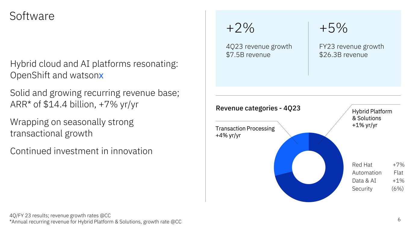 +3.3% Revenue growth yr/yr $11.2B Free cash flow 4Q23 Financial highlights Revenue growth rates @CC 5 “We again demonstrated the fundamental strengths of our business in the fourth quarter through solid, broad-based revenue growth, continued profit margin expansion, increased productivity gains and strong cash generation. Throughout 2023, those strengths enabled us to increase our investment in R&D and talent, and complete nine acquisitions to bolster our hybrid cloud and AI capabilities, all while continuing to return value to shareholders through our dividend.” James Kavanaugh IBM SVP & CFO $17.4B Revenue ~75% Revenue mix (full yr) in software and consulting ~50% Recurring revenue mix (full yr) led by high-value software 140bps Gross margin expansion (operating) 110bps Pre-tax margin expansion (operating) $13.5B Cash and marketable securities FY23