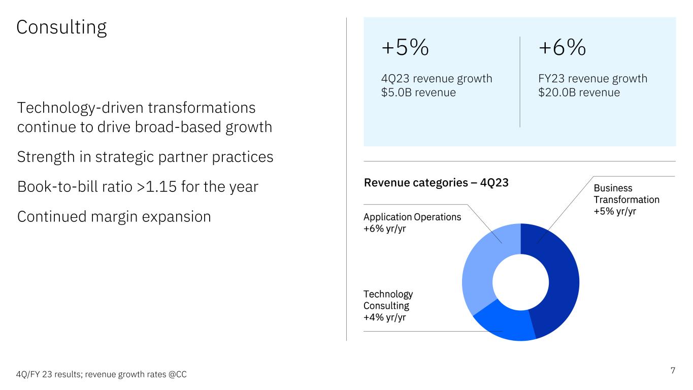 6 +2% 4Q23 revenue growth $7.5B revenue Revenue categories - 4Q23 Transaction Processing +4% yr/yr +5% FY23 revenue growth $26.3B revenue Hybrid Platform & Solutions +1% yr/yr Red Hat +7% Automation Flat Data & AI +1% Security (6%) Software 4Q/FY 23 results; revenue growth rates @CC *Annual recurring revenue for Hybrid Platform & Solutions, growth rate @CC Hybrid cloud and AI platforms resonating: OpenShift and watsonx Solid and growing recurring revenue base; ARR* of $14.4 billion, +7% yr/yr Wrapping on seasonally strong transactional growth Continued investment in innovation
