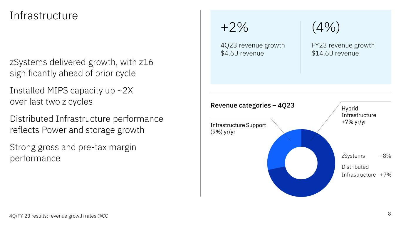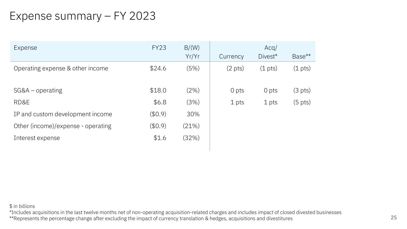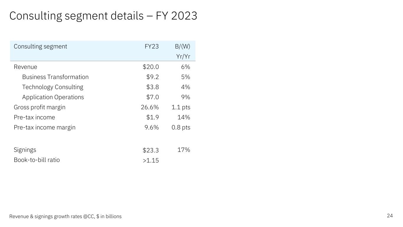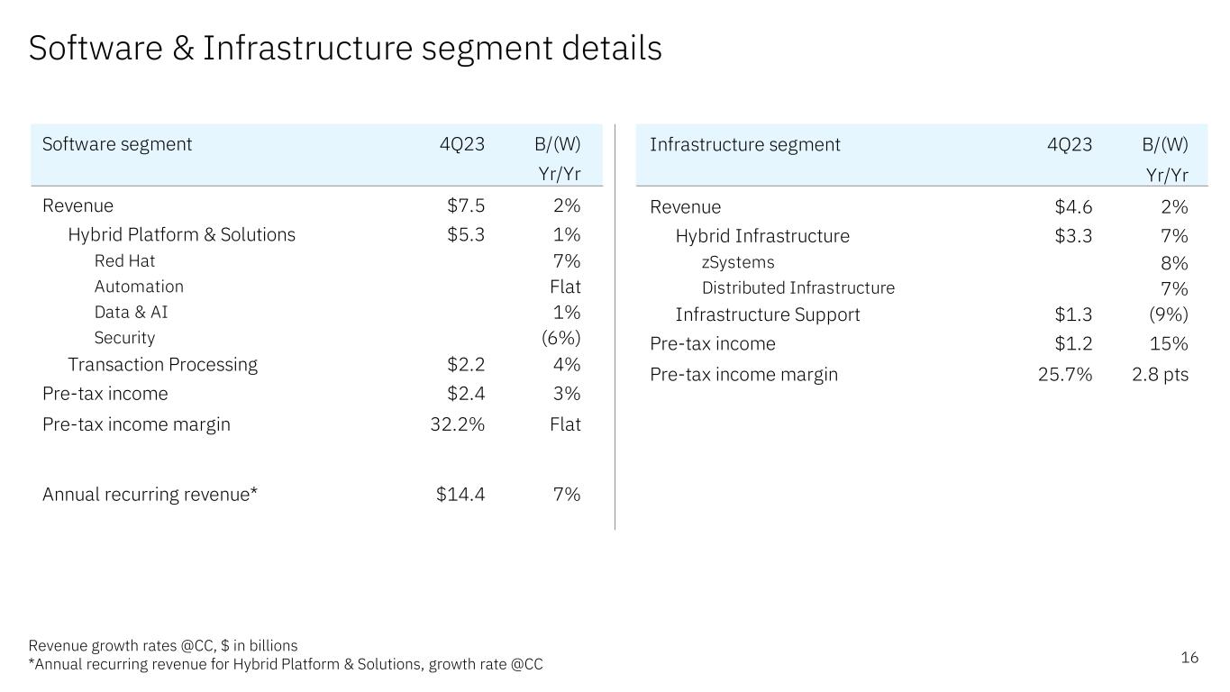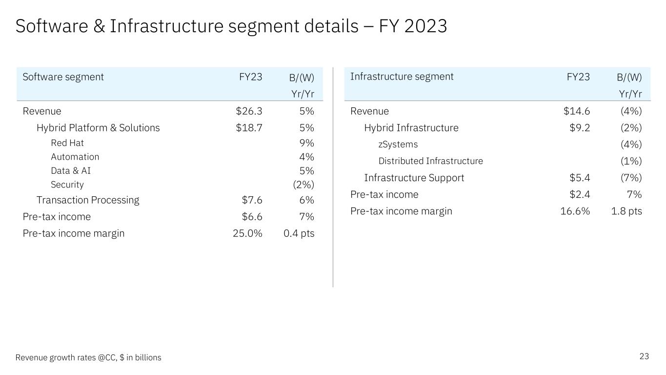 23 Software & Infrastructure segment details – FY 2023 Software segment FY23 B/(W) Yr/Yr Revenue $26.3 5% Hybrid Platform & Solutions $18.7 5% Red Hat 9% Automation 4% Data & AI 5% Security (2%) Transaction Processing $7.6 6% Pre-tax income $6.6 7% Pre-tax income margin 25.0% 0.4 pts Infrastructure segment FY23 B/(W) Yr/Yr Revenue $14.6 (4%) Hybrid Infrastructure $9.2 (2%) zSystems (4%) Distributed Infrastructure (1%) Infrastructure Support $5.4 (7%) Pre-tax income $2.4 7% Pre-tax income margin 16.6% 1.8 pts Revenue growth rates @CC, $ in billions