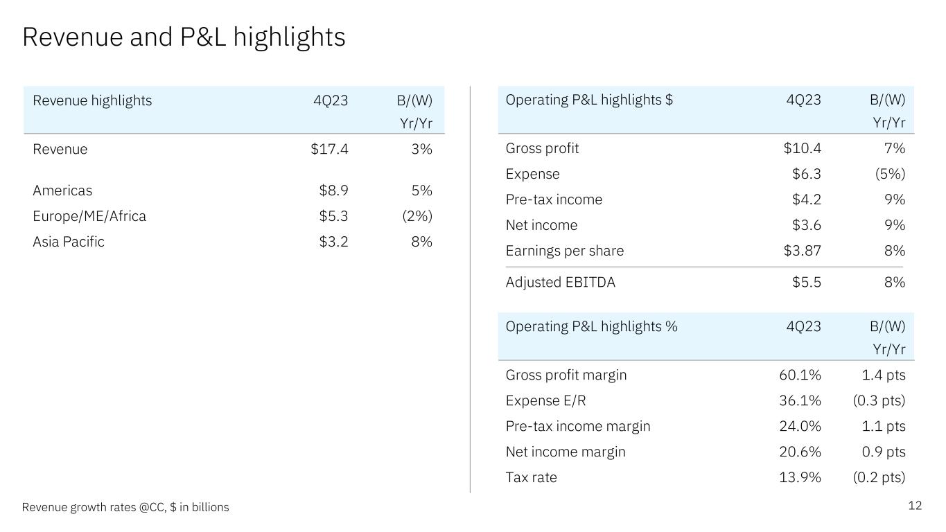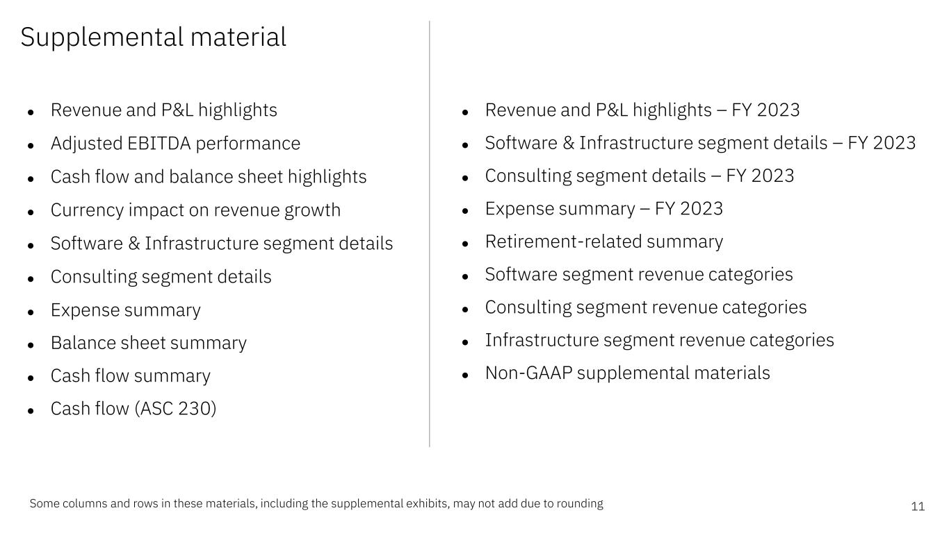 11 Supplemental material ● Revenue and P&L highlights ● Adjusted EBITDA performance ● Cash flow and balance sheet highlights ● Currency impact on revenue growth ● Software & Infrastructure segment details ● Consulting segment details ● Expense summary ● Balance sheet summary ● Cash flow summary ● Cash flow (ASC 230) Some columns and rows in these materials, including the supplemental exhibits, may not add due to rounding ● Revenue and P&L highlights – FY 2023 ● Software & Infrastructure segment details – FY 2023 ● Consulting segment details – FY 2023 ● Expense summary – FY 2023 ● Retirement-related summary ● Software segment revenue categories ● Consulting segment revenue categories ● Infrastructure segment revenue categories ● Non-GAAP supplemental materials
