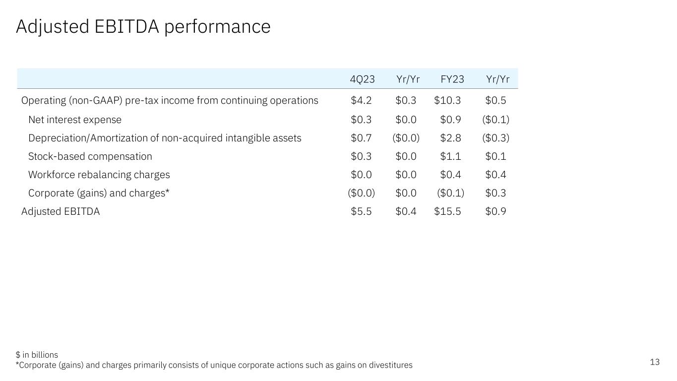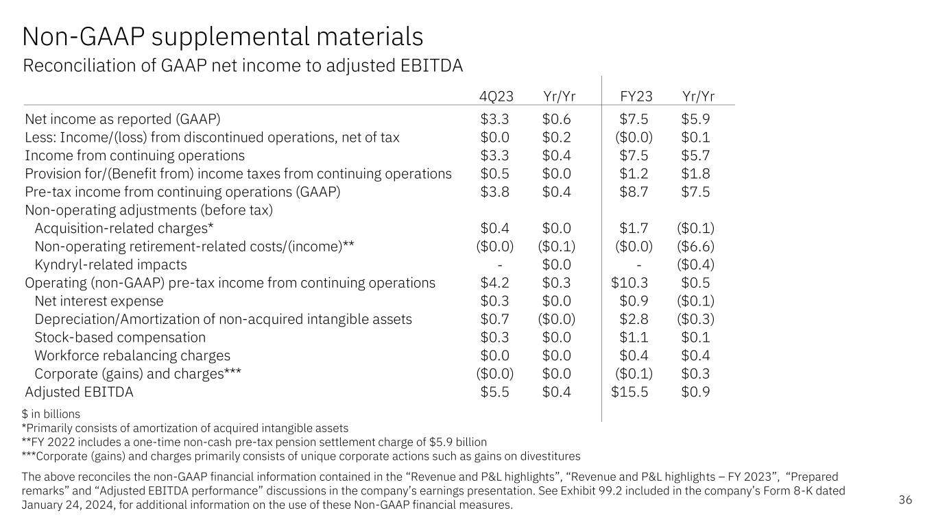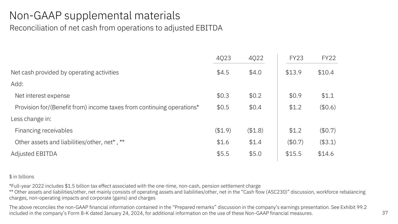 36 $ in billions *Primarily consists of amortization of acquired intangible assets **FY 2022 includes a one-time non-cash pre-tax pension settlement charge of $5.9 billion ***Corporate (gains) and charges primarily consists of unique corporate actions such as gains on divestitures The above reconciles the non-GAAP financial information contained in the “Revenue and P&L highlights”, “Revenue and P&L highlights – FY 2023”, “Prepared remarks” and “Adjusted EBITDA performance” discussions in the company’s earnings presentation. See Exhibit 99.2 included in the company’s Form 8-K dated January 24, 2024, for additional information on the use of these Non-GAAP financial measures. Non-GAAP supplemental materials Reconciliation of GAAP net income to adjusted EBITDA 4Q23 Yr/Yr FY23 Yr/Yr Net income as reported (GAAP) $3.3 $0.6 $7.5 $5.9 Less: Income/(loss) from discontinued operations, net of tax $0.0 $0.2 ($0.0) $0.1 Income from continuing operations $3.3 $0.4 $7.5 $5.7 Provision for/(Benefit from) income taxes from continuing operations $0.5 $0.0 $1.2 $1.8 Pre-tax income from continuing operations (GAAP) $3.8 $0.4 $8.7 $7.5 Non-operating adjustments (before tax) Acquisition-related charges* $0.4 $0.0 $1.7 ($0.1) Non-operating retirement-related costs/(income)** ($0.0) ($0.1) ($0.0) ($6.6) Kyndryl-related impacts - $0.0 - ($0.4) Operating (non-GAAP) pre-tax income from continuing operations $4.2 $0.3 $10.3 $0.5 Net interest expense $0.3 $0.0 $0.9 ($0.1) Depreciation/Amortization of non-acquired intangible assets $0.7 ($0.0) $2.8 ($0.3) Stock-based compensation $0.3 $0.0 $1.1 $0.1 Workforce rebalancing charges $0.0 $0.0 $0.4 $0.4 Corporate (gains) and charges*** ($0.0) $0.0 ($0.1) $0.3 Adjusted EBITDA $5.5 $0.4 $15.5 $0.9