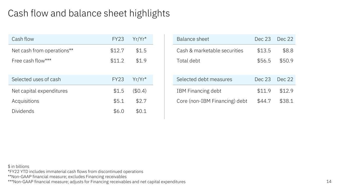 13 Adjusted EBITDA performance $ in billions *Corporate (gains) and charges primarily consists of unique corporate actions such as gains on divestitures 4Q23 Yr/Yr FY23 Yr/Yr Operating (non-GAAP) pre-tax income from continuing operations $4.2 $0.3 $10.3 $0.5 Net interest expense $0.3 $0.0 $0.9 ($0.1) Depreciation/Amortization of non-acquired intangible assets $0.7 ($0.0) $2.8 ($0.3) Stock-based compensation $0.3 $0.0 $1.1 $0.1 Workforce rebalancing charges $0.0 $0.0 $0.4 $0.4 Corporate (gains) and charges* ($0.0) $0.0 ($0.1) $0.3 Adjusted EBITDA $5.5 $0.4 $15.5 $0.9
