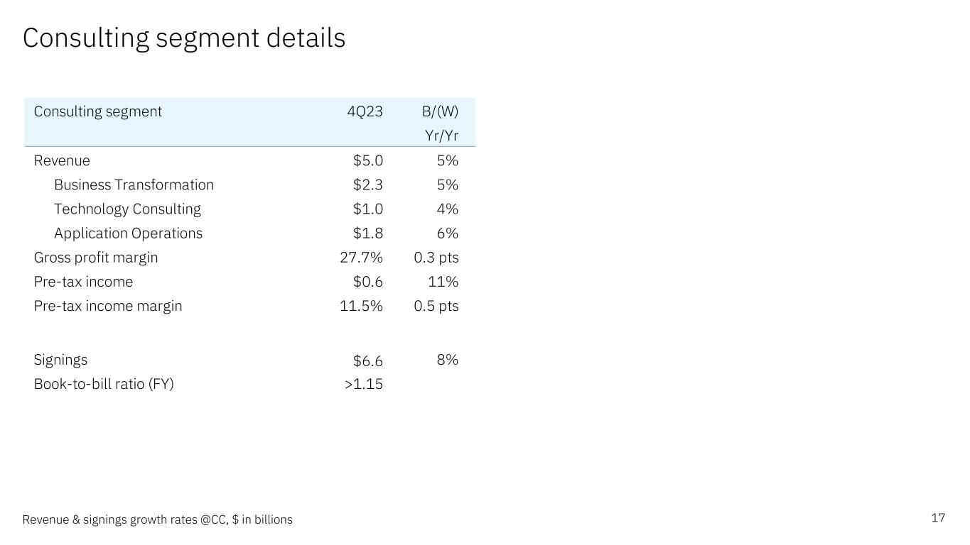 16 Software & Infrastructure segment details Revenue growth rates @CC, $ in billions *Annual recurring revenue for Hybrid Platform & Solutions, growth rate @CC Software segment 4Q23 B/(W) Yr/Yr Revenue $7.5 2% Hybrid Platform & Solutions $5.3 1% Red Hat 7% Automation Flat Data & AI 1% Security (6%) Transaction Processing $2.2 4% Pre-tax income $2.4 3% Pre-tax income margin 32.2% Flat Annual recurring revenue* $14.4 7% Infrastructure segment 4Q23 B/(W) Yr/Yr Revenue $4.6 2% Hybrid Infrastructure $3.3 7% zSystems 8% Distributed Infrastructure 7% Infrastructure Support $1.3 (9%) Pre-tax income $1.2 15% Pre-tax income margin 25.7% 2.8 pts