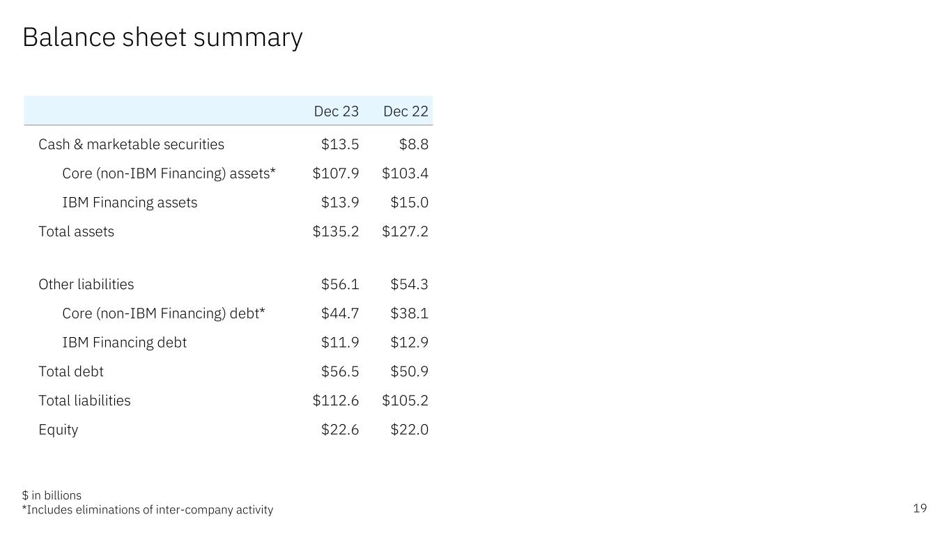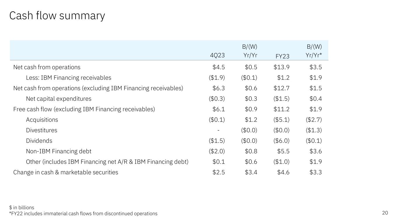 19 Balance sheet summary $ in billions *Includes eliminations of inter-company activity Dec 23 Dec 22 Cash & marketable securities $13.5 $8.8 Core (non-IBM Financing) assets* $107.9 $103.4 IBM Financing assets $13.9 $15.0 Total assets $135.2 $127.2 Other liabilities $56.1 $54.3 Core (non-IBM Financing) debt* $44.7 $38.1 IBM Financing debt $11.9 $12.9 Total debt $56.5 $50.9 Total liabilities $112.6 $105.2 Equity $22.6 $22.0