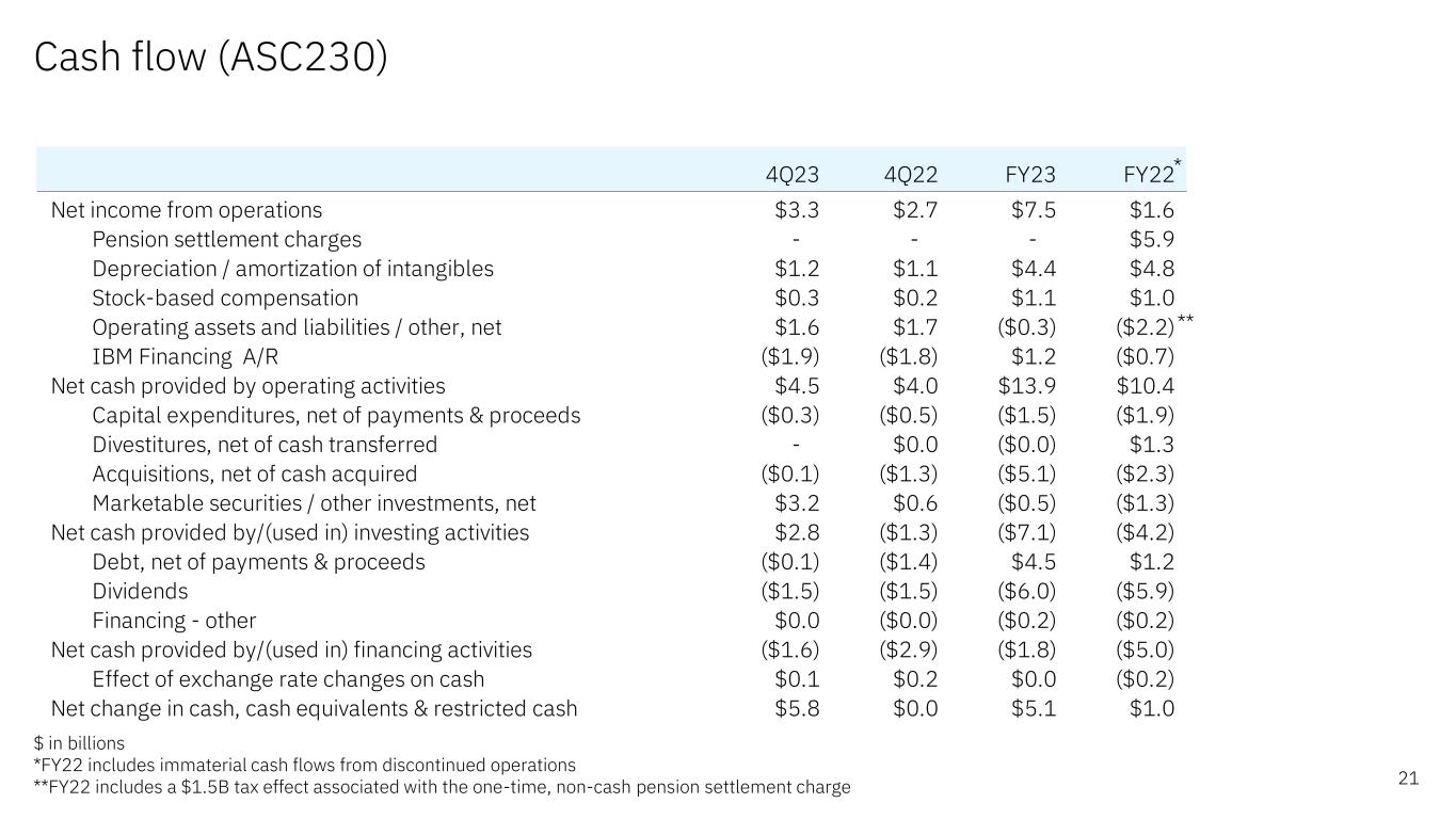 20 Cash flow summary $ in billions *FY22 includes immaterial cash flows from discontinued operations B/(W) B/(W) 4Q23 Yr/Yr FY23 Yr/Yr* Net cash from operations $4.5 $0.5 $13.9 $3.5 Less: IBM Financing receivables ($1.9) ($0.1) $1.2 $1.9 Net cash from operations (excluding IBM Financing receivables) $6.3 $0.6 $12.7 $1.5 Net capital expenditures ($0.3) $0.3 ($1.5) $0.4 Free cash flow (excluding IBM Financing receivables) $6.1 $0.9 $11.2 $1.9 Acquisitions ($0.1) $1.2 ($5.1) ($2.7) Divestitures - ($0.0) ($0.0) ($1.3) Dividends ($1.5) ($0.0) ($6.0) ($0.1) Non-IBM Financing debt ($2.0) $0.8 $5.5 $3.6 Other (includes IBM Financing net A/R & IBM Financing debt) $0.1 $0.6 ($1.0) $1.9 Change in cash & marketable securities $2.5 $3.4 $4.6 $3.3