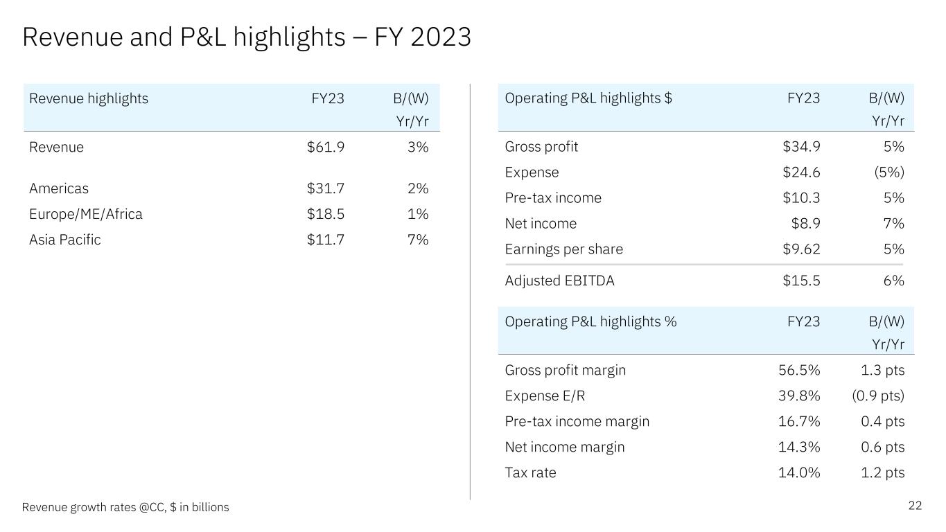 22 Revenue and P&L highlights – FY 2023 Revenue growth rates @CC, $ in billions Revenue highlights FY23 B/(W) Yr/Yr Revenue $61.9 3% Americas $31.7 2% Europe/ME/Africa $18.5 1% Asia Pacific $11.7 7% Operating P&L highlights $ FY23 B/(W) Yr/Yr Gross profit $34.9 5% Expense $24.6 (5%) Pre-tax income $10.3 5% Net income $8.9 7% Earnings per share $9.62 5% Adjusted EBITDA $15.5 6% Operating P&L highlights % FY23 B/(W) Yr/Yr Gross profit margin 56.5% 1.3 pts Expense E/R 39.8% (0.9 pts) Pre-tax income margin 16.7% 0.4 pts Net income margin 14.3% 0.6 pts Tax rate 14.0% 1.2 pts
