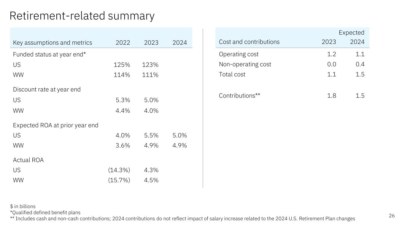 26 Retirement-related summary Key assumptions and metrics 2022 2023 2024 Funded status at year end* US 125% 123% WW 114% 111% Discount rate at year end US 5.3% 5.0% WW 4.4% 4.0% Expected ROA at prior year end US 4.0% 5.5% 5.0% WW 3.6% 4.9% 4.9% Actual ROA US (14.3%) 4.3% WW (15.7%) 4.5% $ in billions *Qualified defined benefit plans ** Includes cash and non-cash contributions; 2024 contributions do not reflect impact of salary increase related to the 2024 U.S. Retirement Plan changes Expected Cost and contributions 2023 2024 Operating cost 1.2 1.1 Non-operating cost 0.0 0.4 Total cost 1.1 1.5 Contributions** 1.8 1.5