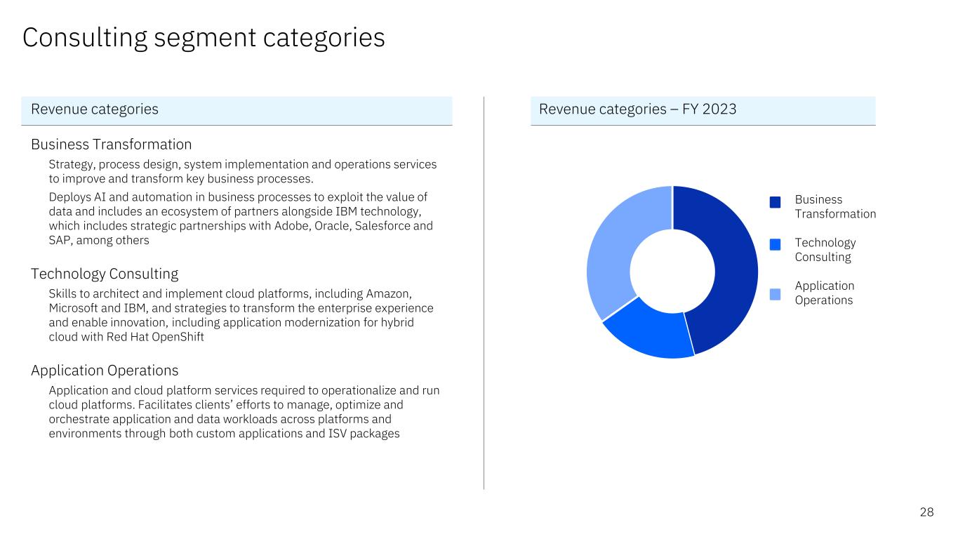 27 Software segment categories Revenue categories – FY 2023Revenue categories Red Hat Automation Data & AI Security Hybrid Platform & Solutions Transaction Processing Hybrid Platform & Solutions Software, infused with AI, to help clients operate, manage, and optimize their IT resources and business processes within hybrid, multi-cloud environments Red Hat: incl. RHEL, OpenShift, Ansible Automation: incl. business automation, AIOps and management, integration, and application servers Data & AI: incl. data fabric, customer care, data management, business analytics, dataops & governance, asset & supply chain management, information exchange and weather Security: incl. software and services for threat, data and identity Transaction Processing Software that supports clients’ mission-critical on-premise workloads in industries such as banking, airlines and retail incl. transaction processing software such as Customer Information Control System and storage software, and analytics and integration software running on IBM operating systems (e.g., DB2 and WebSphere running on z/OS)