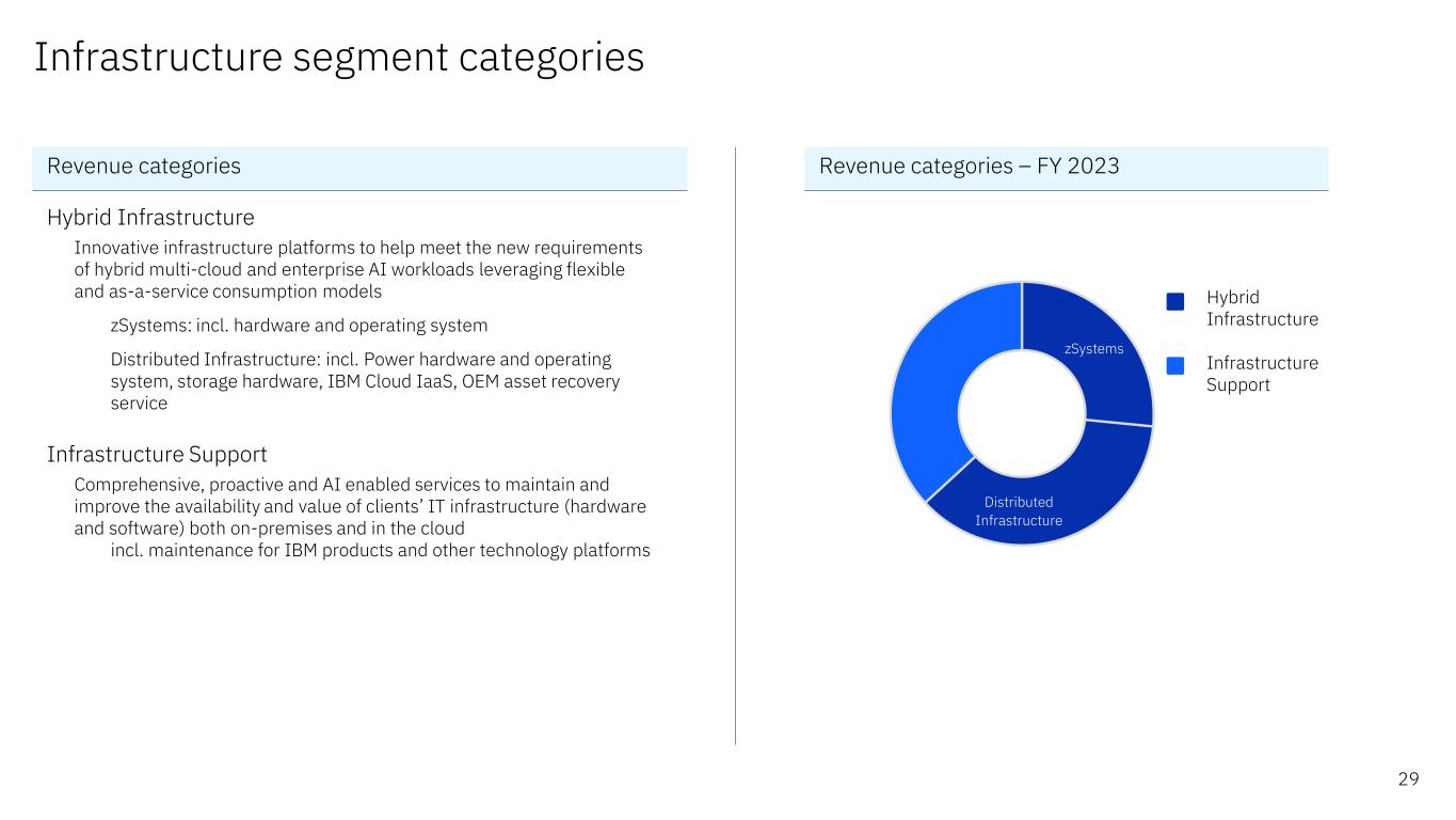 28 Consulting segment categories Revenue categories Business Transformation Technology Consulting Application Operations Revenue categories – FY 2023 Business Transformation Strategy, process design, system implementation and operations services to improve and transform key business processes. Deploys AI and automation in business processes to exploit the value of data and includes an ecosystem of partners alongside IBM technology, which includes strategic partnerships with Adobe, Oracle, Salesforce and SAP, among others Technology Consulting Skills to architect and implement cloud platforms, including Amazon, Microsoft and IBM, and strategies to transform the enterprise experience and enable innovation, including application modernization for hybrid cloud with Red Hat OpenShift Application Operations Application and cloud platform services required to operationalize and run cloud platforms. Facilitates clients’ efforts to manage, optimize and orchestrate application and data workloads across platforms and environments through both custom applications and ISV packages
