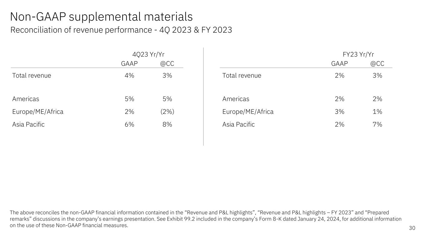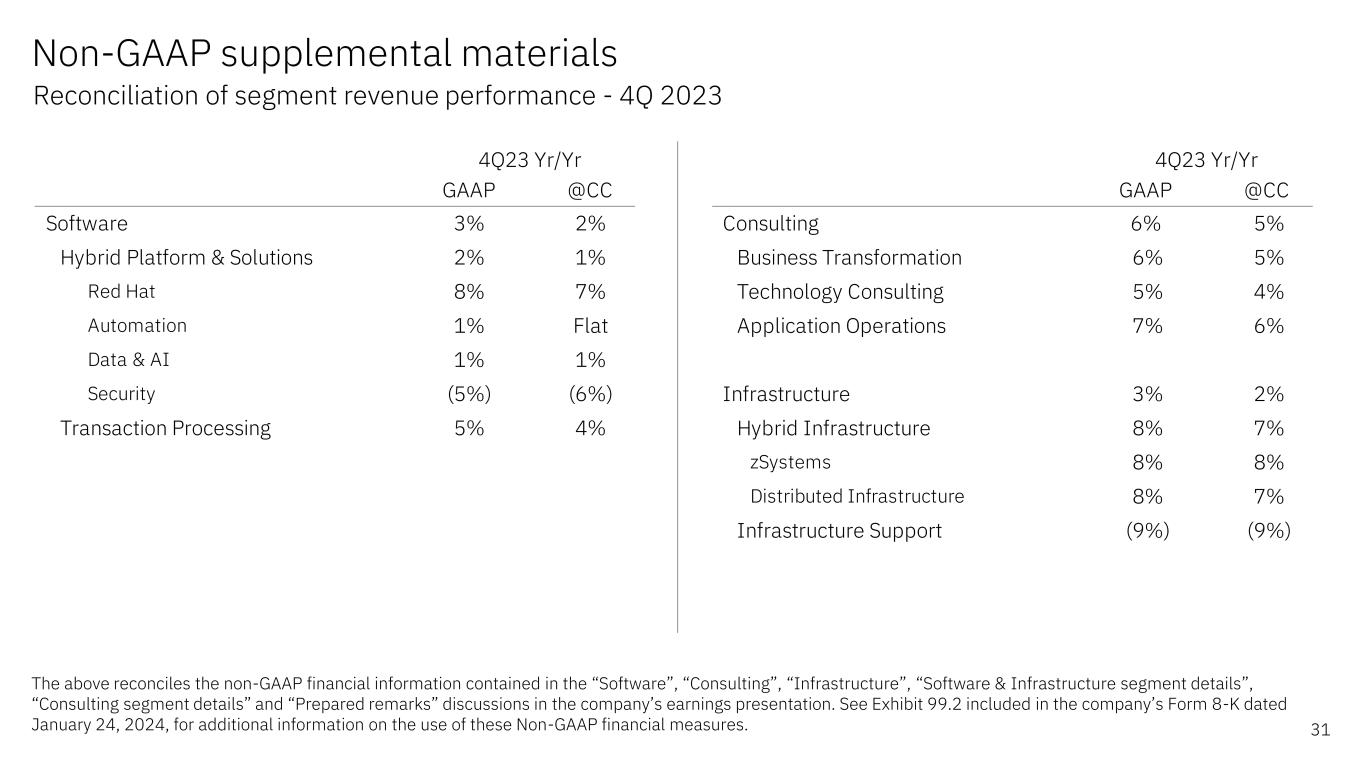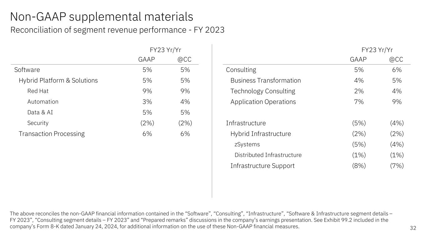 31 Non-GAAP supplemental materials The above reconciles the non-GAAP financial information contained in the “Software”, “Consulting”, “Infrastructure”, “Software & Infrastructure segment details”, “Consulting segment details” and “Prepared remarks” discussions in the company’s earnings presentation. See Exhibit 99.2 included in the company’s Form 8-K dated January 24, 2024, for additional information on the use of these Non-GAAP financial measures. Reconciliation of segment revenue performance - 4Q 2023 GAAP @CC Software 3% 2% Hybrid Platform & Solutions 2% 1% Red Hat 8% 7% Automation 1% Flat Data & AI 1% 1% Security (5%) (6%) Transaction Processing 5% 4% 4Q23 Yr/Yr GAAP @CC Consulting 6% 5% Business Transformation 6% 5% Technology Consulting 5% 4% Application Operations 7% 6% Infrastructure 3% 2% Hybrid Infrastructure 8% 7% zSystems 8% 8% Distributed Infrastructure 8% 7% Infrastructure Support (9%) (9%) 4Q23 Yr/Yr