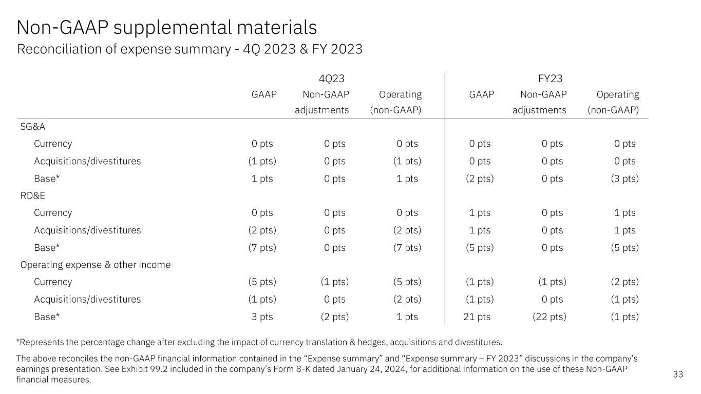 GAAP @CC Software 5% 5% Hybrid Platform & Solutions 5% 5% Red Hat 9% 9% Automation 3% 4% Data & AI 5% 5% Security (2%) (2%) Transaction Processing 6% 6% FY23 Yr/Yr GAAP @CC Consulting 5% 6% Business Transformation 4% 5% Technology Consulting 2% 4% Application Operations 7% 9% Infrastructure (5%) (4%) Hybrid Infrastructure (2%) (2%) zSystems (5%) (4%) Distributed Infrastructure (1%) (1%) Infrastructure Support (8%) (7%) FY23 Yr/Yr 32 Non-GAAP supplemental materials The above reconciles the non-GAAP financial information contained in the “Software”, “Consulting”, “Infrastructure”, “Software & Infrastructure segment details – FY 2023”, “Consulting segment details – FY 2023” and “Prepared remarks” discussions in the company’s earnings presentation. See Exhibit 99.2 included in the company’s Form 8-K dated January 24, 2024, for additional information on the use of these Non-GAAP financial measures. Reconciliation of segment revenue performance - FY 2023