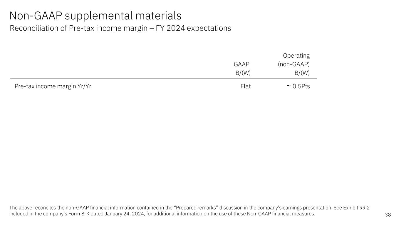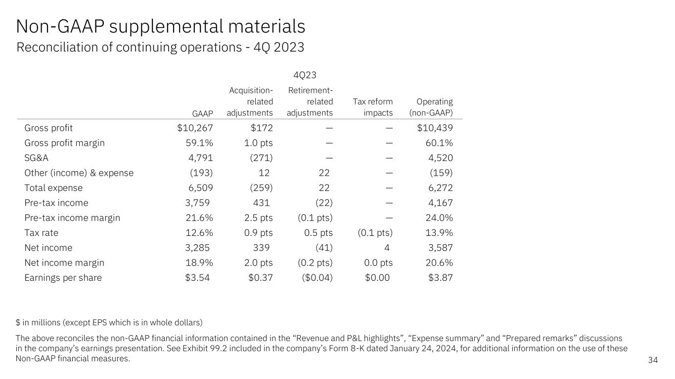 GAAP Acquisition- related adjustments Retirement- related adjustments Tax reform impacts Operating (non-GAAP) Gross profit $34,300 $631 — — $34,931 Gross profit margin 55.4% 1.0 pts — — 56.5% SG&A 19,003 (1,039) — — 17,964 Other (income) & expense (914) 10 39 — (866) Total expense  25,610 (1,029) 39 — 24,620 Pre-tax income 8,690 1,660 (39) — 10,311 Pre-tax income margin 14.0% 2.7 pts (0.1 pts) — 16.7% Tax rate 13.5% 1.4 pts (0.0 pts) (0.9 pts) 14.0% Net income 7,514 1,292 (30) 95 8,870 Net income margin 12.1% 2.1 pts (0.0 pts) 0.2 pts 14.3% Earnings per share $8.15 $1.40 ($0.03) $0.10 $9.62 FY23 35 Non-GAAP supplemental materials $ in millions (except EPS which is in whole dollars) The above reconciles the non-GAAP financial information contained in the “Revenue and P&L highlights – FY 2023”, “Expense summary – FY 2023” and “Prepared remarks” discussions in the company’s earnings presentation. See Exhibit 99.2 included in the company’s Form 8-K dated January 24, 2024, for additional information on the use of these Non-GAAP financial measures. Reconciliation of continuing operations - FY 2023