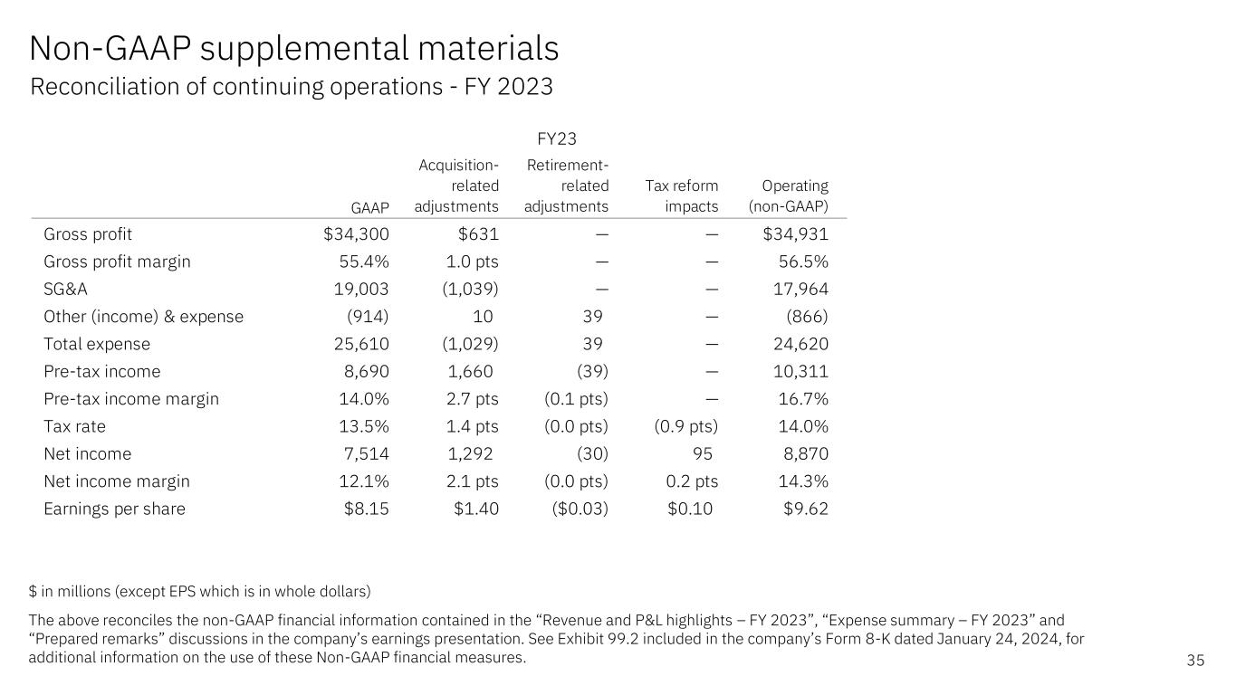 34 Non-GAAP supplemental materials $ in millions (except EPS which is in whole dollars) The above reconciles the non-GAAP financial information contained in the “Revenue and P&L highlights”, “Expense summary” and “Prepared remarks” discussions in the company’s earnings presentation. See Exhibit 99.2 included in the company’s Form 8-K dated January 24, 2024, for additional information on the use of these Non-GAAP financial measures. Reconciliation of continuing operations - 4Q 2023 GAAP Acquisition- related adjustments Retirement- related adjustments Tax reform impacts Operating (non-GAAP) Gross profit $10,267 $172 — — $10,439 Gross profit margin 59.1% 1.0 pts — — 60.1% SG&A 4,791 (271) — — 4,520 Other (income) & expense (193) 12 22 — (159) Total expense  6,509 (259) 22 — 6,272 Pre-tax income 3,759 431 (22) — 4,167 Pre-tax income margin 21.6% 2.5 pts (0.1 pts) — 24.0% Tax rate 12.6% 0.9 pts 0.5 pts (0.1 pts) 13.9% Net income 3,285 339 (41) 4 3,587 Net income margin 18.9% 2.0 pts (0.2 pts) 0.0 pts 20.6% Earnings per share $3.54 $0.37 ($0.04) $0.00 $3.87 4Q23
