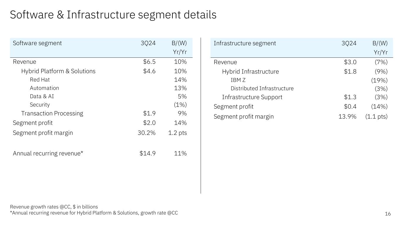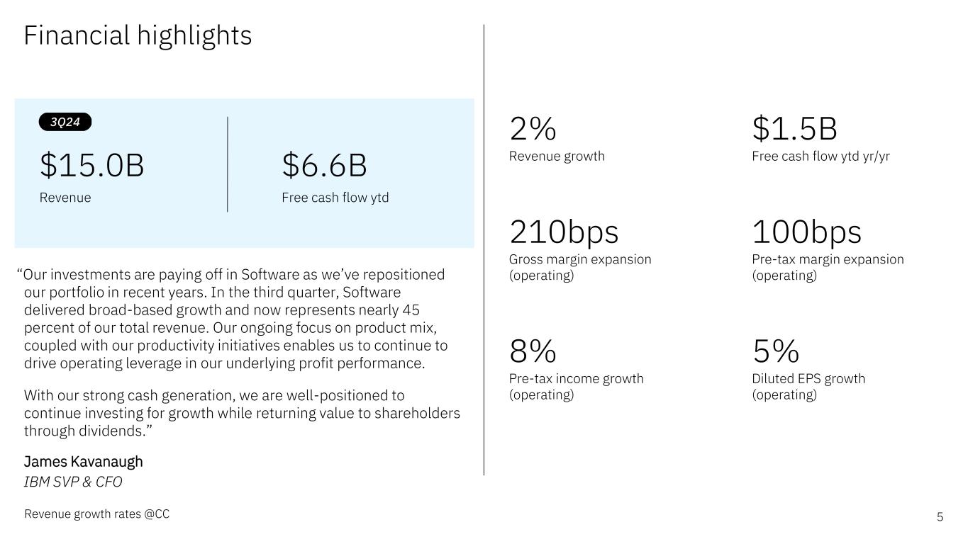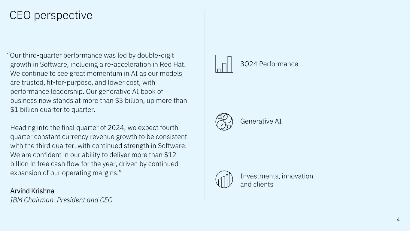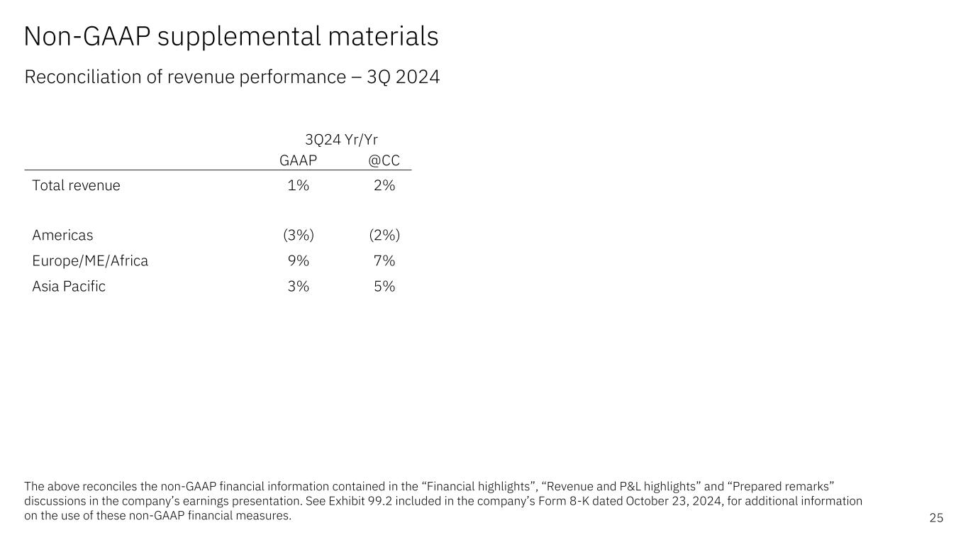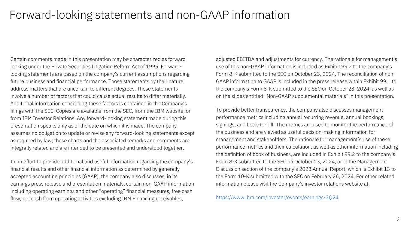 Forward-looking statements and non-GAAP information Certain comments made in this presentation may be characterized as forward looking under the Private Securities Litigation Reform Act of 1995. Forward- looking statements are based on the company’s current assumptions regarding future business and financial performance. Those statements by their nature address matters that are uncertain to different degrees. Those statements involve a number of factors that could cause actual results to differ materially. Additional information concerning these factors is contained in the Company’s filings with the SEC. Copies are available from the SEC, from the IBM website, or from IBM Investor Relations. Any forward-looking statement made during this presentation speaks only as of the date on which it is made. The company assumes no obligation to update or revise any forward-looking statements except as required by law; these charts and the associated remarks and comments are integrally related and are intended to be presented and understood together. In an effort to provide additional and useful information regarding the company’s financial results and other financial information as determined by generally accepted accounting principles (GAAP), the company also discusses, in its earnings press release and presentation materials, certain non-GAAP information including operating earnings and other “operating” financial measures, free cash flow, net cash from operating activities excluding IBM Financing receivables, adjusted EBITDA and adjustments for currency. The rationale for management’s use of this non-GAAP information is included as Exhibit 99.2 to the company’s Form 8-K submitted to the SEC on October 23, 2024. The reconciliation of non- GAAP information to GAAP is included in the press release within Exhibit 99.1 to the company’s Form 8-K submitted to the SEC on October 23, 2024, as well as on the slides entitled “Non-GAAP supplemental materials” in this presentation. To provide better transparency, the company also discusses management performance metrics including annual recurring revenue, annual bookings, signings, and book-to-bill. The metrics are used to monitor the performance of the business and are viewed as useful decision-making information for management and stakeholders. The rationale for management’s use of these performance metrics and their calculation, as well as other information including the definition of book of business, are included in Exhibit 99.2 to the company’s Form 8-K submitted to the SEC on October 23, 2024, or in the Management Discussion section of the company’s 2023 Annual Report, which is Exhibit 13 to the Form 10-K submitted with the SEC on February 26, 2024. For other related information please visit the Company’s investor relations website at: https://www.ibm.com/investor/events/earnings-3Q24 2