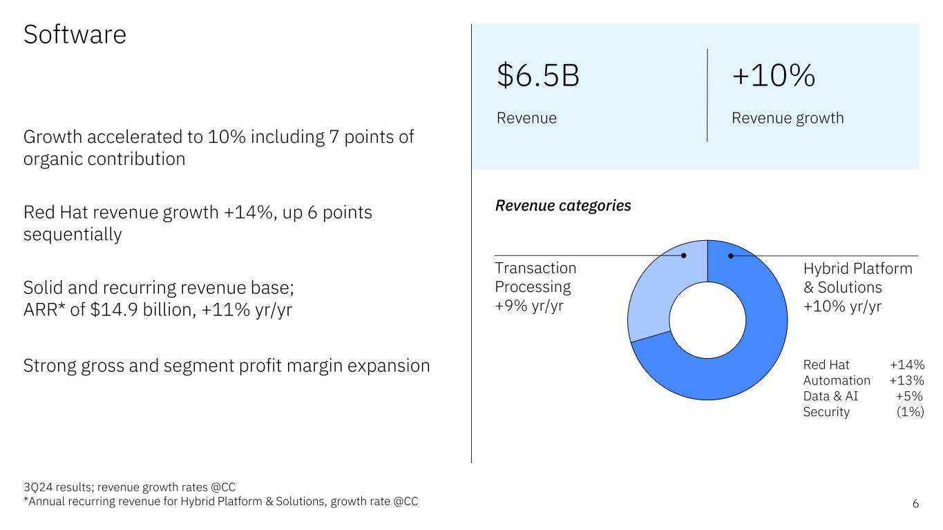 Financial highlights 5Revenue growth rates @CC $15.0B Revenue $6.6B Free cash flow ytd 3Q24 “Our investments are paying off in Software as we’ve repositioned our portfolio in recent years. In the third quarter, Software delivered broad-based growth and now represents nearly 45 percent of our total revenue. Our ongoing focus on product mix, coupled with our productivity initiatives enables us to continue to drive operating leverage in our underlying profit performance. With our strong cash generation, we are well-positioned to continue investing for growth while returning value to shareholders through dividends.” James Kavanaugh IBM SVP & CFO $1.5B Free cash flow ytd yr/yr 100bps Pre-tax margin expansion (operating) 5% Diluted EPS growth (operating) 2% Revenue growth 210bps Gross margin expansion (operating) 8% Pre-tax income growth (operating)