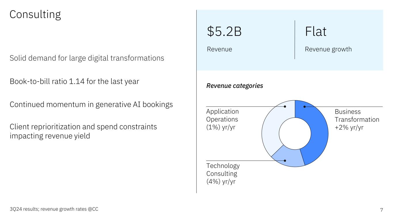 6 Revenue categories Red Hat +14% Automation +13% Data & AI +5% Security (1%) Software 3Q24 results; revenue growth rates @CC *Annual recurring revenue for Hybrid Platform & Solutions, growth rate @CC Transaction Processing +9% yr/yr Hybrid Platform & Solutions +10% yr/yr Growth accelerated to 10% including 7 points of organic contribution Red Hat revenue growth +14%, up 6 points sequentially Solid and recurring revenue base; ARR* of $14.9 billion, +11% yr/yr Strong gross and segment profit margin expansion $6.5B Revenue +10% Revenue growth