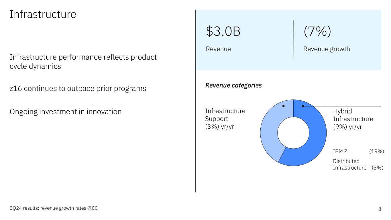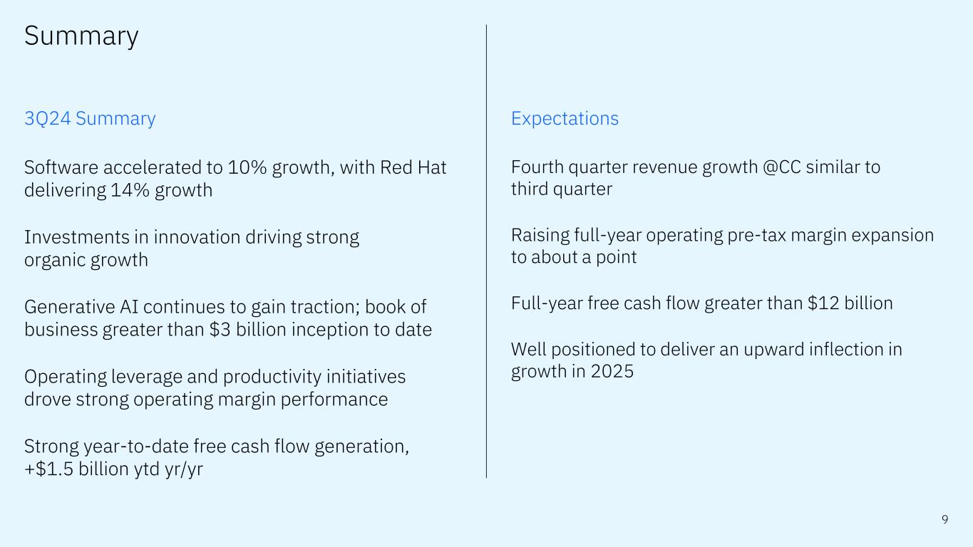 8 Infrastructure 3Q24 results; revenue growth rates @CC Revenue categories IBM Z (19%) Distributed Infrastructure (3%) Infrastructure Support (3%) yr/yr Hybrid Infrastructure (9%) yr/yr Infrastructure performance reflects product cycle dynamics z16 continues to outpace prior programs Ongoing investment in innovation $3.0B Revenue (7%) Revenue growth