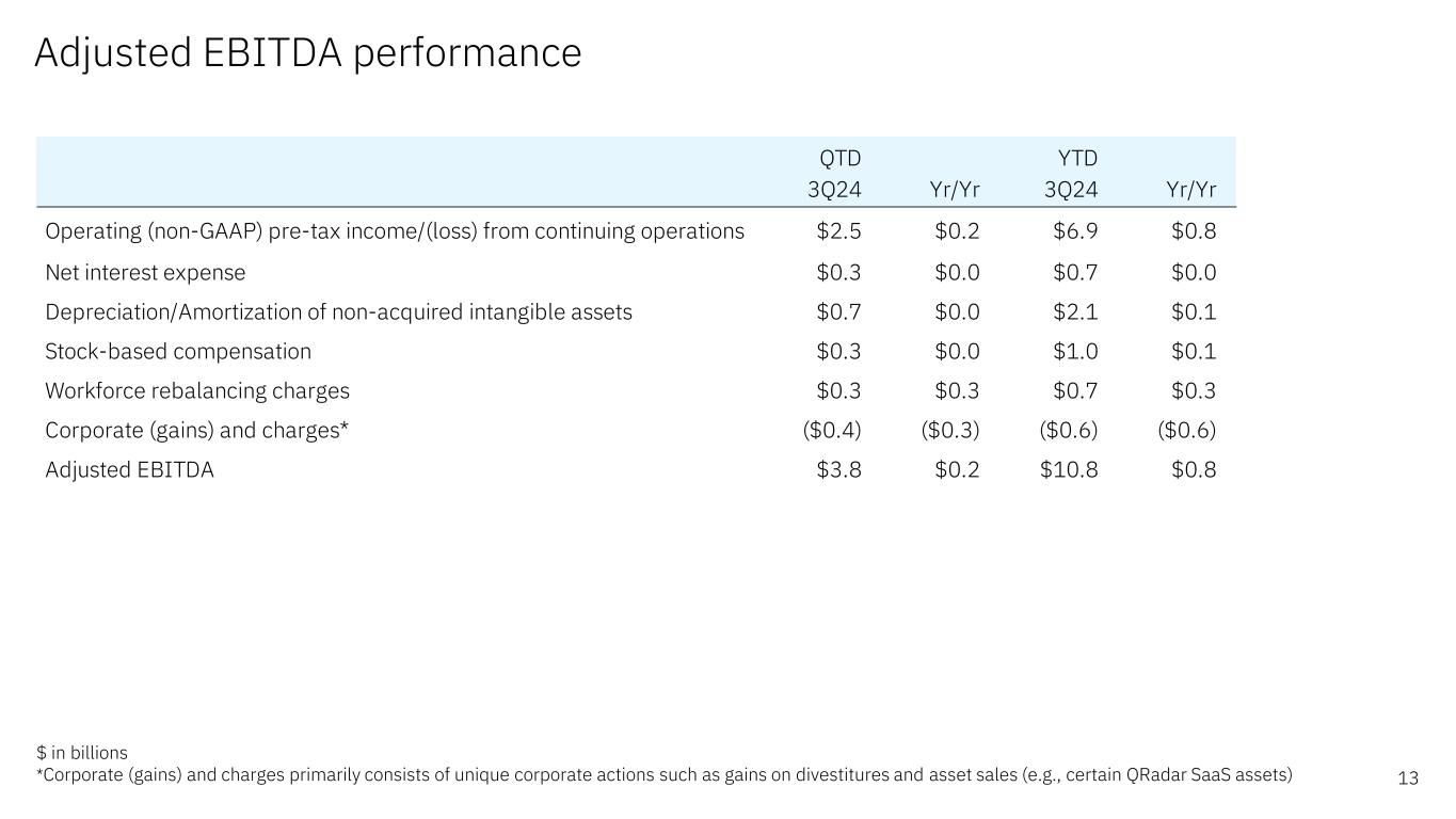 QTD YTD 3Q24 Yr/Yr 3Q24 Yr/Yr Net income/(loss) as reported (GAAP)* ($0.3) ($2.0) $3.1 ($1.1) Less: income/(loss) from discontinued operations, net of tax ($0.0) ($0.0) $0.0 $0.0 Income/(loss) from continuing operations ($0.3) ($2.0) $3.1 ($1.1) Provision for/(Benefit from) income taxes from continuing operations ($0.5) ($0.6) ($0.6) ($1.3) Pre-tax income/(loss) from continuing operations (GAAP) ($0.8) ($2.7) $2.5 ($2.4) Non-operating adjustments (before tax) Acquisition-related charges** $0.5 $0.1 $1.5 $0.2 Non-operating retirement-related costs/(income)* $2.8 $2.8 $3.0 $3.0 Operating (non-GAAP) pre-tax income/(loss) from continuing operations $2.5 $0.2 $6.9 $0.8 Net interest expense $0.3 $0.0 $0.7 $0.0 Depreciation/Amortization of non-acquired intangible assets $0.7 $0.0 $2.1 $0.1 Stock-based compensation $0.3 $0.0 $1.0 $0.1 Workforce rebalancing charges $0.3 $0.3 $0.7 $0.3 Corporate (gains) and charges*** ($0.4) ($0.3) ($0.6) ($0.6) Adjusted EBITDA $3.8 $0.2 $10.8 $0.8 Non-GAAP supplemental materials Reconciliation of GAAP net income to adjusted EBITDA 30 $ in billions *2024 includes the impact of a one-time, non-cash pension settlement charge of $2.7B ($2.0B net of tax) **Primarily consists of amortization of acquired intangible assets ***Corporate (gains) and charges primarily consists of unique corporate actions such as gains on divestitures and asset sales (e.g., certain QRadar SaaS assets) The above reconciles the non-GAAP financial information contained in the “Revenue and P&L highlights", “Adjusted EBITDA performance” and "Prepared remarks” discussions in the company’s earnings presentation. See Exhibit 99.2 included in the company’s Form 8-K dated October 23, 2024, for additional information on the use of these non-GAAP financial measures.
