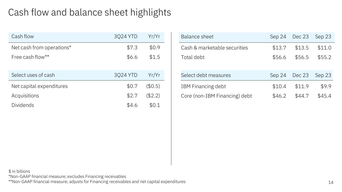 Adjusted EBITDA performance 13 $ in billions *Corporate (gains) and charges primarily consists of unique corporate actions such as gains on divestitures and asset sales (e.g., certain QRadar SaaS assets) QTD YTD 3Q24 Yr/Yr 3Q24 Yr/Yr Operating (non-GAAP) pre-tax income/(loss) from continuing operations $2.5 $0.2 $6.9 $0.8 Net interest expense $0.3 $0.0 $0.7 $0.0 Depreciation/Amortization of non-acquired intangible assets $0.7 $0.0 $2.1 $0.1 Stock-based compensation $0.3 $0.0 $1.0 $0.1 Workforce rebalancing charges $0.3 $0.3 $0.7 $0.3 Corporate (gains) and charges* ($0.4) ($0.3) ($0.6) ($0.6) Adjusted EBITDA $3.8 $0.2 $10.8 $0.8