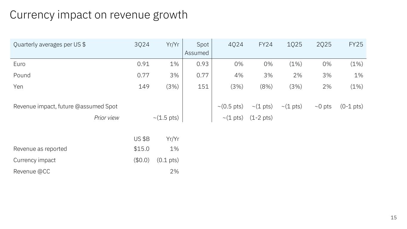 Cash flow and balance sheet highlights 14 $ in billions *Non-GAAP financial measure; excludes Financing receivables **Non-GAAP financial measure; adjusts for Financing receivables and net capital expenditures Balance sheet Sep 24 Dec 23 Sep 23 Cash & marketable securities $13.7 $13.5 $11.0 Total debt $56.6 $56.5 $55.2 Select debt measures Sep 24 Dec 23 Sep 23 IBM Financing debt $10.4 $11.9 $9.9 Core (non-IBM Financing) debt $46.2 $44.7 $45.4 Cash flow 3Q24 YTD Yr/Yr Net cash from operations* $7.3 $0.9 Free cash flow** $6.6 $1.5 Select uses of cash 3Q24 YTD Yr/Yr Net capital expenditures $0.7 ($0.5) Acquisitions $2.7 ($2.2) Dividends $4.6 $0.1