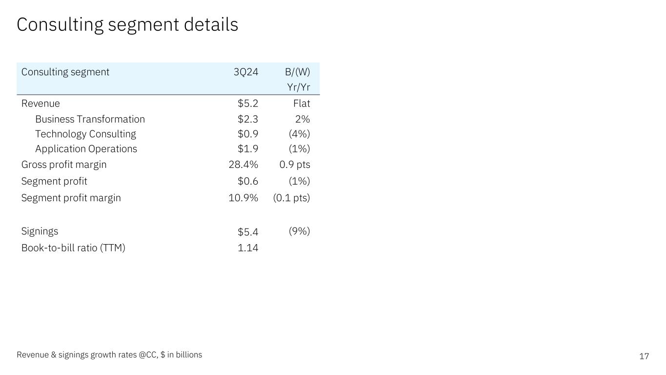 Software & Infrastructure segment details 16 Revenue growth rates @CC, $ in billions *Annual recurring revenue for Hybrid Platform & Solutions, growth rate @CC Software segment 3Q24 B/(W) Yr/Yr Revenue $6.5 10% Hybrid Platform & Solutions $4.6 10% Red Hat 14% Automation 13% Data & AI 5% Security (1%) Transaction Processing $1.9 9% Segment profit $2.0 14% Segment profit margin 30.2% 1.2 pts Annual recurring revenue* $14.9 11% Infrastructure segment 3Q24 B/(W) Yr/Yr Revenue $3.0 (7%) Hybrid Infrastructure $1.8 (9%) IBM Z (19%) Distributed Infrastructure (3%) Infrastructure Support $1.3 (3%) Segment profit $0.4 (14%) Segment profit margin 13.9% (1.1 pts)