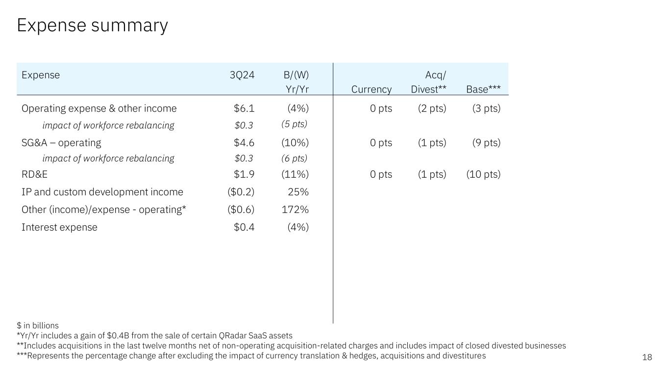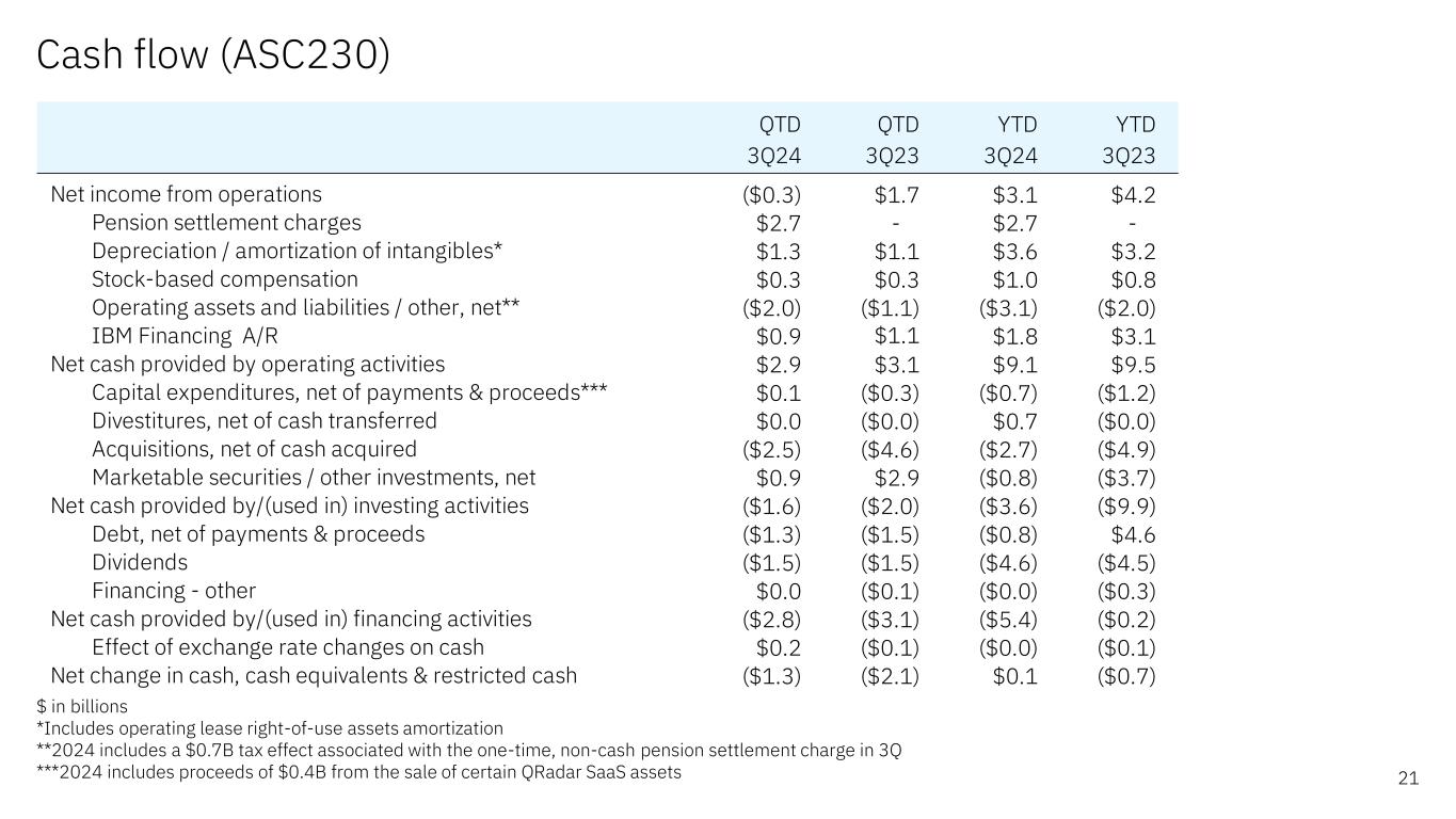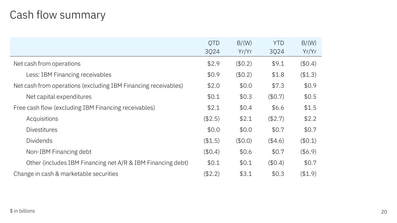 Cash flow summary 20$ in billions QTD B/(W) YTD B/(W) 3Q24 Yr/Yr 3Q24 Yr/Yr Net cash from operations $2.9 ($0.2) $9.1 ($0.4) Less: IBM Financing receivables $0.9 ($0.2) $1.8 ($1.3) Net cash from operations (excluding IBM Financing receivables) $2.0 $0.0 $7.3 $0.9 Net capital expenditures $0.1 $0.3 ($0.7) $0.5 Free cash flow (excluding IBM Financing receivables) $2.1 $0.4 $6.6 $1.5 Acquisitions ($2.5) $2.1 ($2.7) $2.2 Divestitures $0.0 $0.0 $0.7 $0.7 Dividends ($1.5) ($0.0) ($4.6) ($0.1) Non-IBM Financing debt ($0.4) $0.6 $0.7 ($6.9) Other (includes IBM Financing net A/R & IBM Financing debt) $0.1 $0.1 ($0.4) $0.7 Change in cash & marketable securities ($2.2) $3.1 $0.3 ($1.9)