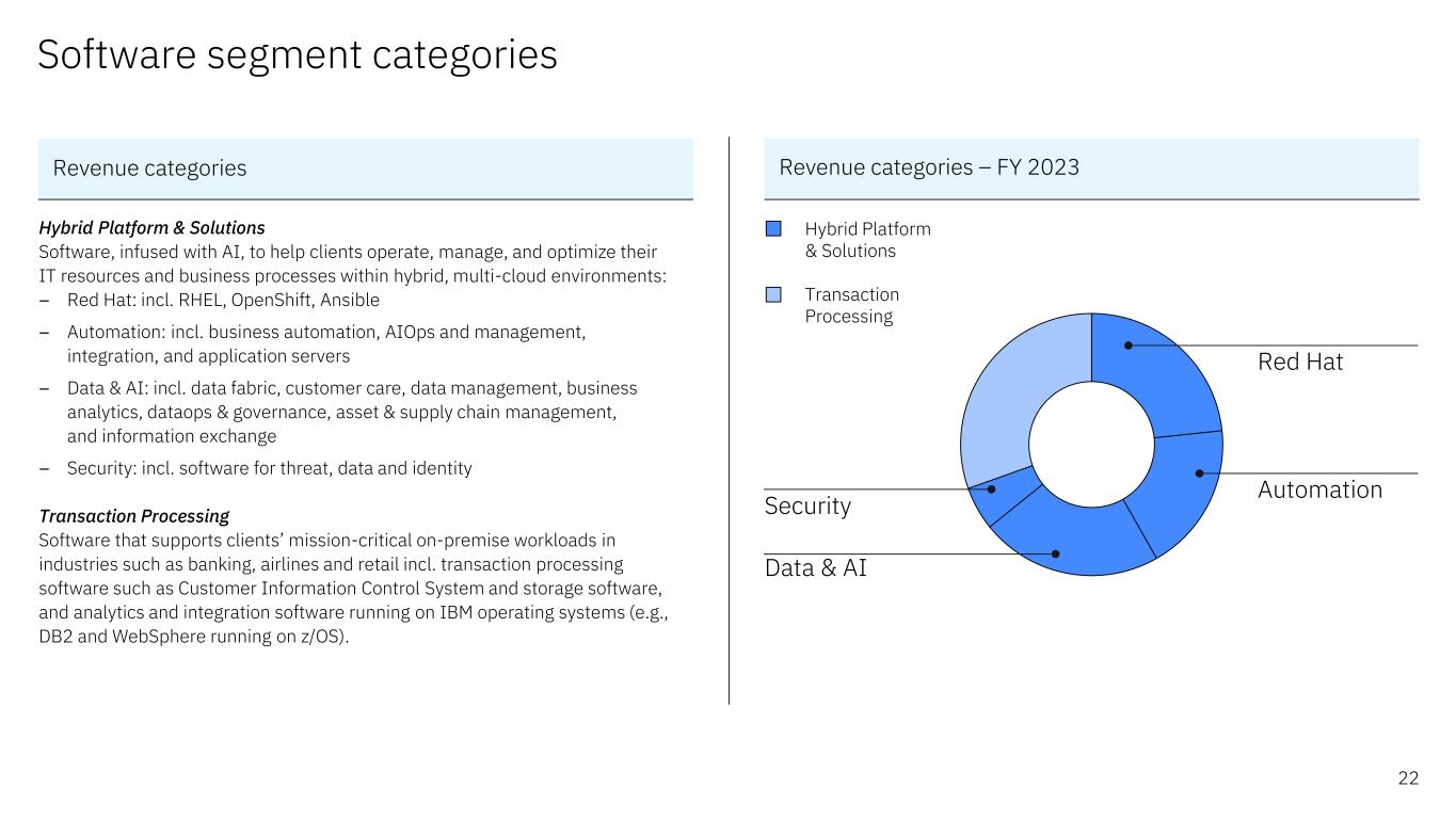 Software segment categories Revenue categories – FY 2023 Hybrid Platform & Solutions Transaction Processing Hybrid Platform & Solutions Software, infused with AI, to help clients operate, manage, and optimize their IT resources and business processes within hybrid, multi-cloud environments: – Red Hat: incl. RHEL, OpenShift, Ansible – Automation: incl. business automation, AIOps and management, integration, and application servers – Data & AI: incl. data fabric, customer care, data management, business analytics, dataops & governance, asset & supply chain management, and information exchange – Security: incl. software for threat, data and identity Transaction Processing Software that supports clients’ mission-critical on-premise workloads in industries such as banking, airlines and retail incl. transaction processing software such as Customer Information Control System and storage software, and analytics and integration software running on IBM operating systems (e.g., DB2 and WebSphere running on z/OS). Revenue categories Red Hat Data & AI Security Automation 22