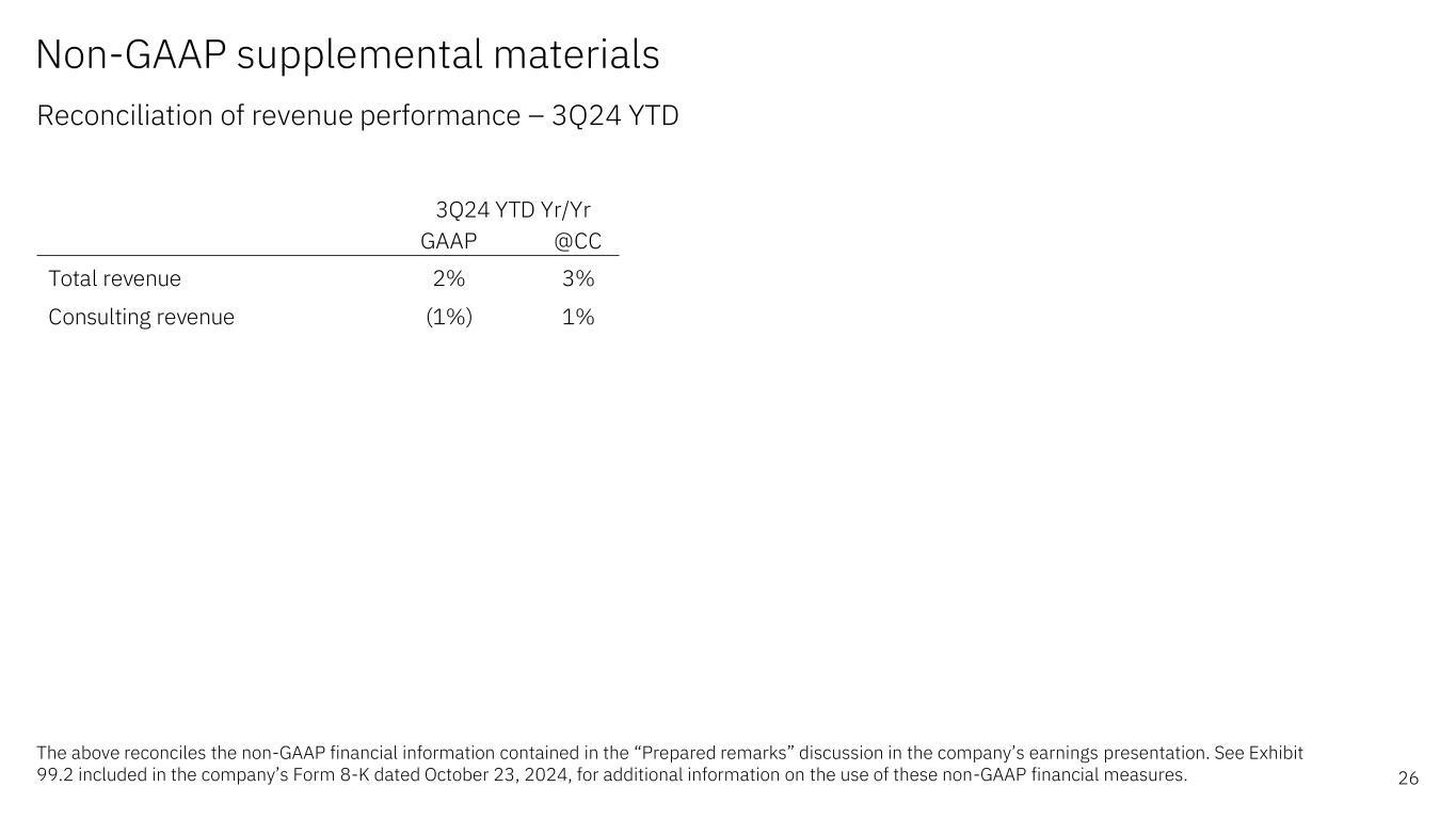 Non-GAAP supplemental materials Reconciliation of revenue performance – 3Q 2024 25 The above reconciles the non-GAAP financial information contained in the “Financial highlights”, “Revenue and P&L highlights” and “Prepared remarks” discussions in the company’s earnings presentation. See Exhibit 99.2 included in the company’s Form 8-K dated October 23, 2024, for additional information on the use of these non-GAAP financial measures. GAAP @CC Total revenue 1% 2% Americas (3%) (2%) Europe/ME/Africa 9% 7% Asia Pacific 3% 5% 3Q24 Yr/Yr