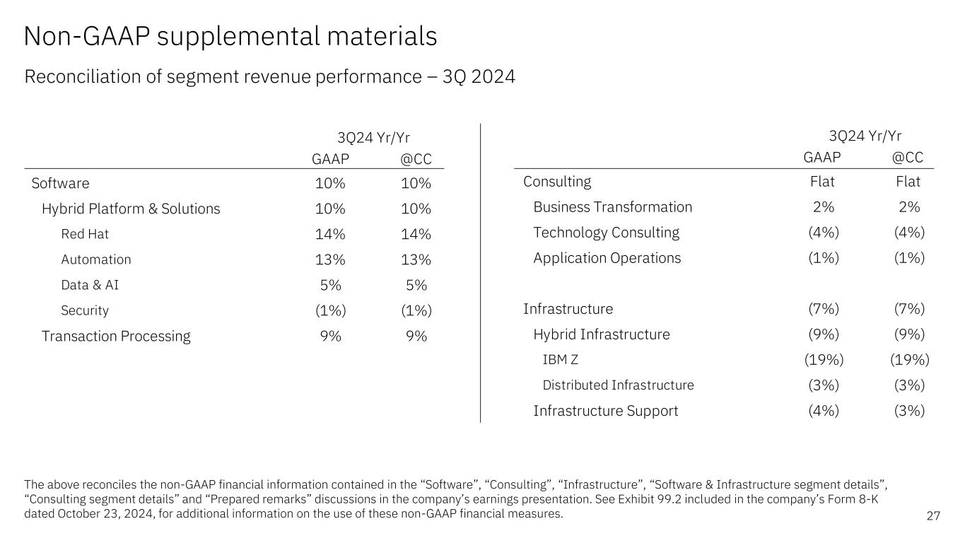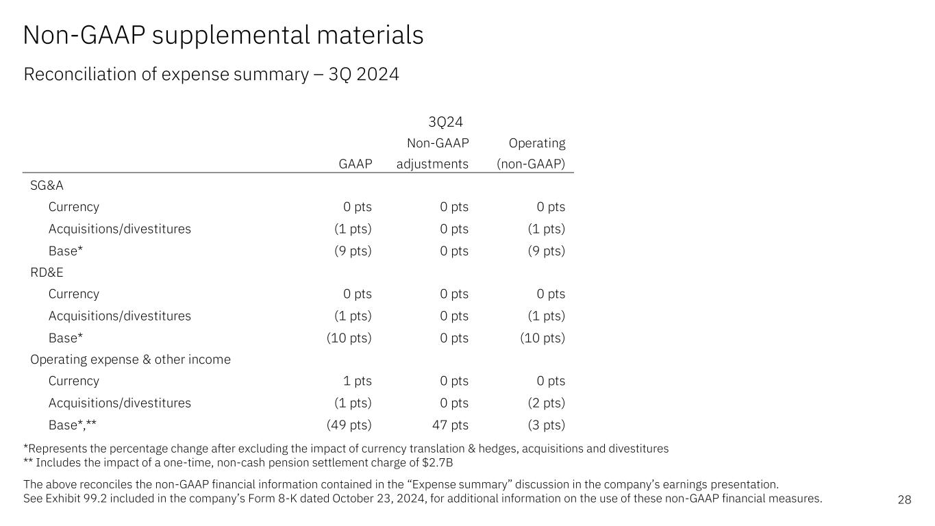 GAAP @CC Software 10% 10% Hybrid Platform & Solutions 10% 10% Red Hat 14% 14% Automation 13% 13% Data & AI 5% 5% Security (1%) (1%) Transaction Processing 9% 9% 3Q24 Yr/Yr GAAP @CC Consulting Flat Flat Business Transformation 2% 2% Technology Consulting (4%) (4%) Application Operations (1%) (1%) Infrastructure (7%) (7%) Hybrid Infrastructure (9%) (9%) IBM Z (19%) (19%) Distributed Infrastructure (3%) (3%) Infrastructure Support (4%) (3%) 3Q24 Yr/Yr Non-GAAP supplemental materials Reconciliation of segment revenue performance – 3Q 2024 27 The above reconciles the non-GAAP financial information contained in the “Software”, “Consulting”, “Infrastructure”, “Software & Infrastructure segment details”, “Consulting segment details” and “Prepared remarks” discussions in the company’s earnings presentation. See Exhibit 99.2 included in the company’s Form 8-K dated October 23, 2024, for additional information on the use of these non-GAAP financial measures.