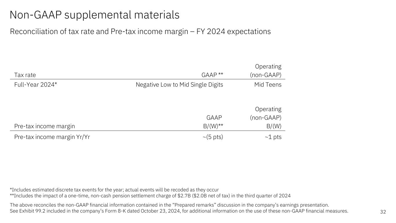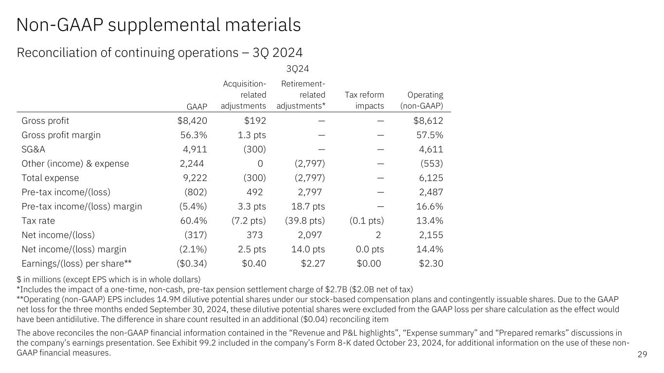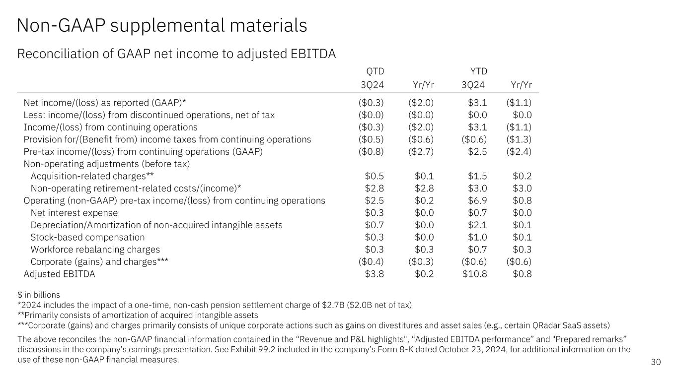 Non-GAAP supplemental materials Reconciliation of continuing operations – 3Q 2024 29 $ in millions (except EPS which is in whole dollars) *Includes the impact of a one-time, non-cash, pre-tax pension settlement charge of $2.7B ($2.0B net of tax) **Operating (non-GAAP) EPS includes 14.9M dilutive potential shares under our stock-based compensation plans and contingently issuable shares. Due to the GAAP net loss for the three months ended September 30, 2024, these dilutive potential shares were excluded from the GAAP loss per share calculation as the effect would have been antidilutive. The difference in share count resulted in an additional ($0.04) reconciling item The above reconciles the non-GAAP financial information contained in the “Revenue and P&L highlights”, “Expense summary” and “Prepared remarks” discussions in the company’s earnings presentation. See Exhibit 99.2 included in the company’s Form 8-K dated October 23, 2024, for additional information on the use of these non- GAAP financial measures. GAAP Acquisition- related adjustments Retirement- related adjustments* Tax reform impacts Operating (non-GAAP) Gross profit $8,420 $192 — — $8,612 Gross profit margin 56.3% 1.3 pts — — 57.5% SG&A 4,911 (300) — — 4,611 Other (income) & expense 2,244 0 (2,797) — (553) Total expense  9,222 (300) (2,797) — 6,125 Pre-tax income/(loss) (802) 492 2,797 — 2,487 Pre-tax income/(loss) margin (5.4%) 3.3 pts 18.7 pts — 16.6% Tax rate 60.4% (7.2 pts) (39.8 pts) (0.1 pts) 13.4% Net income/(loss) (317) 373 2,097 2 2,155 Net income/(loss) margin (2.1%) 2.5 pts 14.0 pts 0.0 pts 14.4% Earnings/(loss) per share** ($0.34) $0.40 $2.27 $0.00 $2.30 3Q24