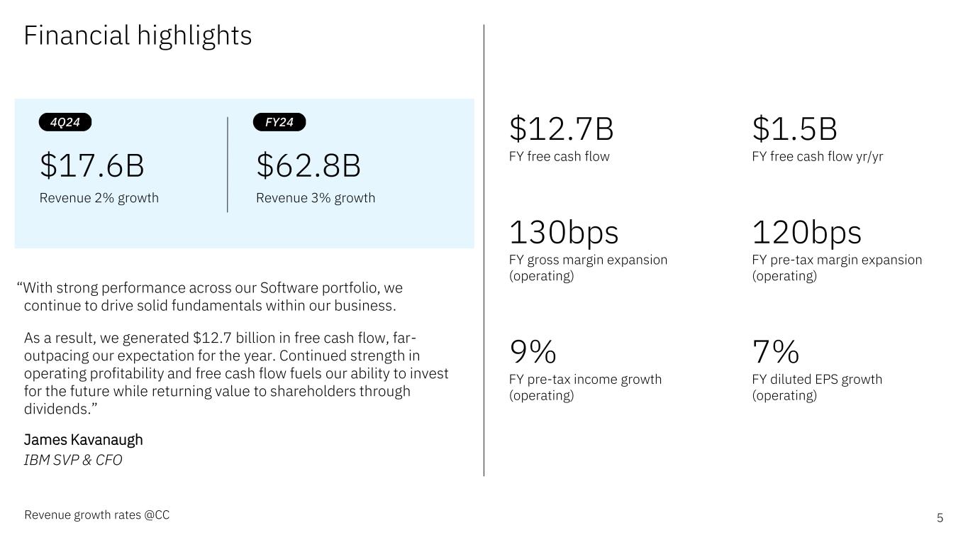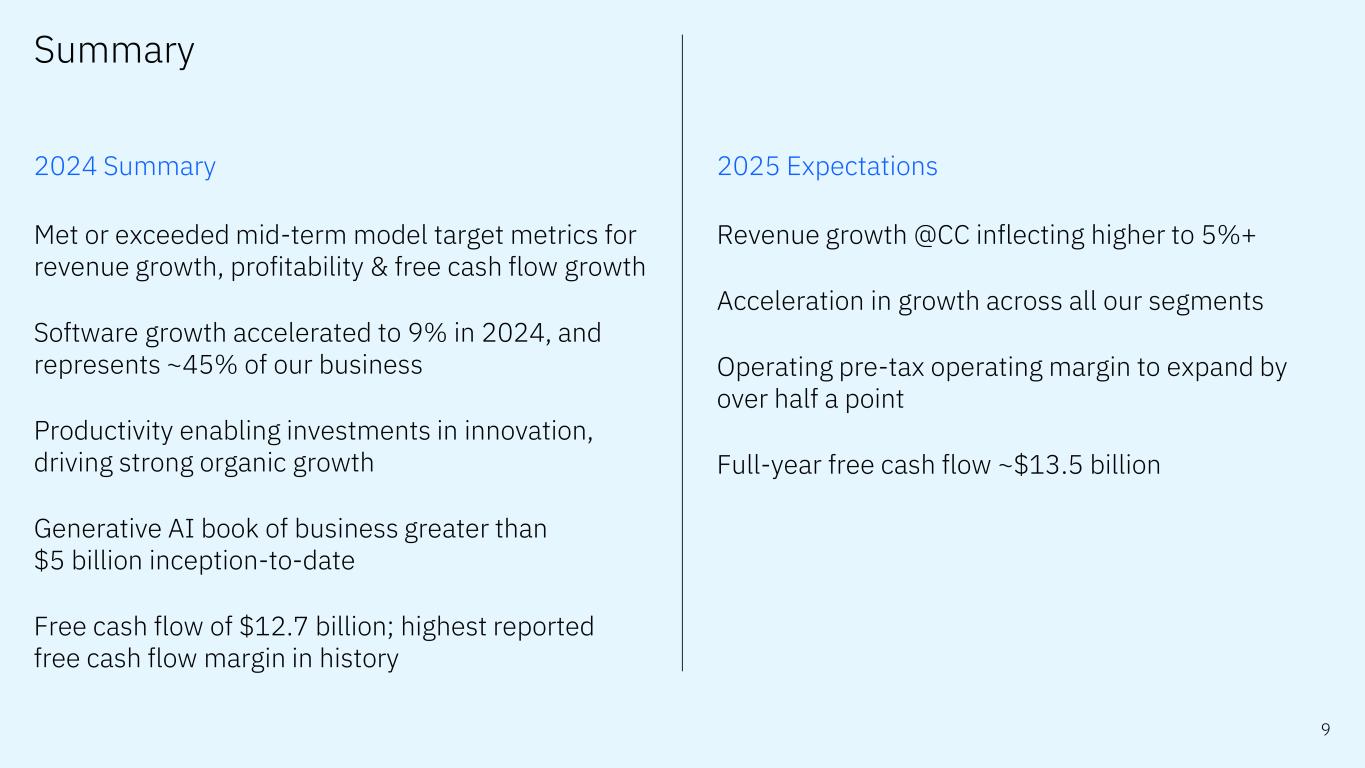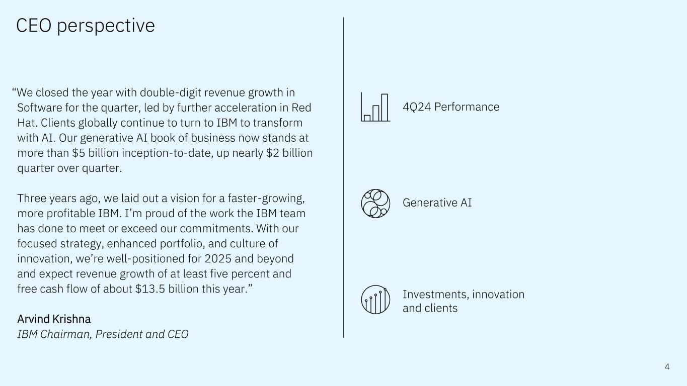 Forward-looking statements and non-GAAP information Certain comments made in this presentation may be characterized as forward looking under the Private Securities Litigation Reform Act of 1995. Forward- looking statements are based on the company’s current assumptions regarding future business and financial performance. Those statements by their nature address matters that are uncertain to different degrees. Those statements involve a number of factors that could cause actual results to differ materially. Additional information concerning these factors is contained in the Company’s filings with the SEC. Copies are available from the SEC, from the IBM website, or from IBM Investor Relations. Any forward-looking statement made during this presentation speaks only as of the date on which it is made. The company assumes no obligation to update or revise any forward-looking statements except as required by law; these charts and the associated remarks and comments are integrally related and are intended to be presented and understood together. In an effort to provide additional and useful information regarding the company’s financial results and other financial information as determined by generally accepted accounting principles (GAAP), the company also discusses, in its earnings press release and presentation materials, certain non-GAAP information including operating earnings and other “operating” financial measures, free cash flow, net cash from operating activities excluding IBM Financing receivables, adjusted EBITDA and adjustments for currency. The rationale for management’s use of this non-GAAP information is included as Exhibit 99.2 to the company’s Form 8-K submitted to the SEC on January 29, 2025. The reconciliation of non- GAAP information to GAAP is included in the press release within Exhibit 99.1 to the company’s Form 8-K submitted to the SEC on January 29, 2025, as well as on the slides entitled “Non-GAAP supplemental materials” in this presentation. To provide better transparency, the company also discusses management performance metrics including annual recurring revenue, annual bookings, signings, and book-to-bill. The metrics are used to monitor the performance of the business and are viewed as useful decision-making information for management and stakeholders. The rationale for management’s use of these performance metrics and their calculation, as well as other information including the definition of book of business, are included in Exhibit 99.2 to the company’s Form 8-K submitted to the SEC on January 29, 2025, or in the Management Discussion section of the company’s 2023 Annual Report, which is Exhibit 13 to the Form 10-K submitted with the SEC on February 26, 2024. For other related information please visit the Company’s investor relations website at: https://www.ibm.com/investor/events/earnings-4Q24 2
