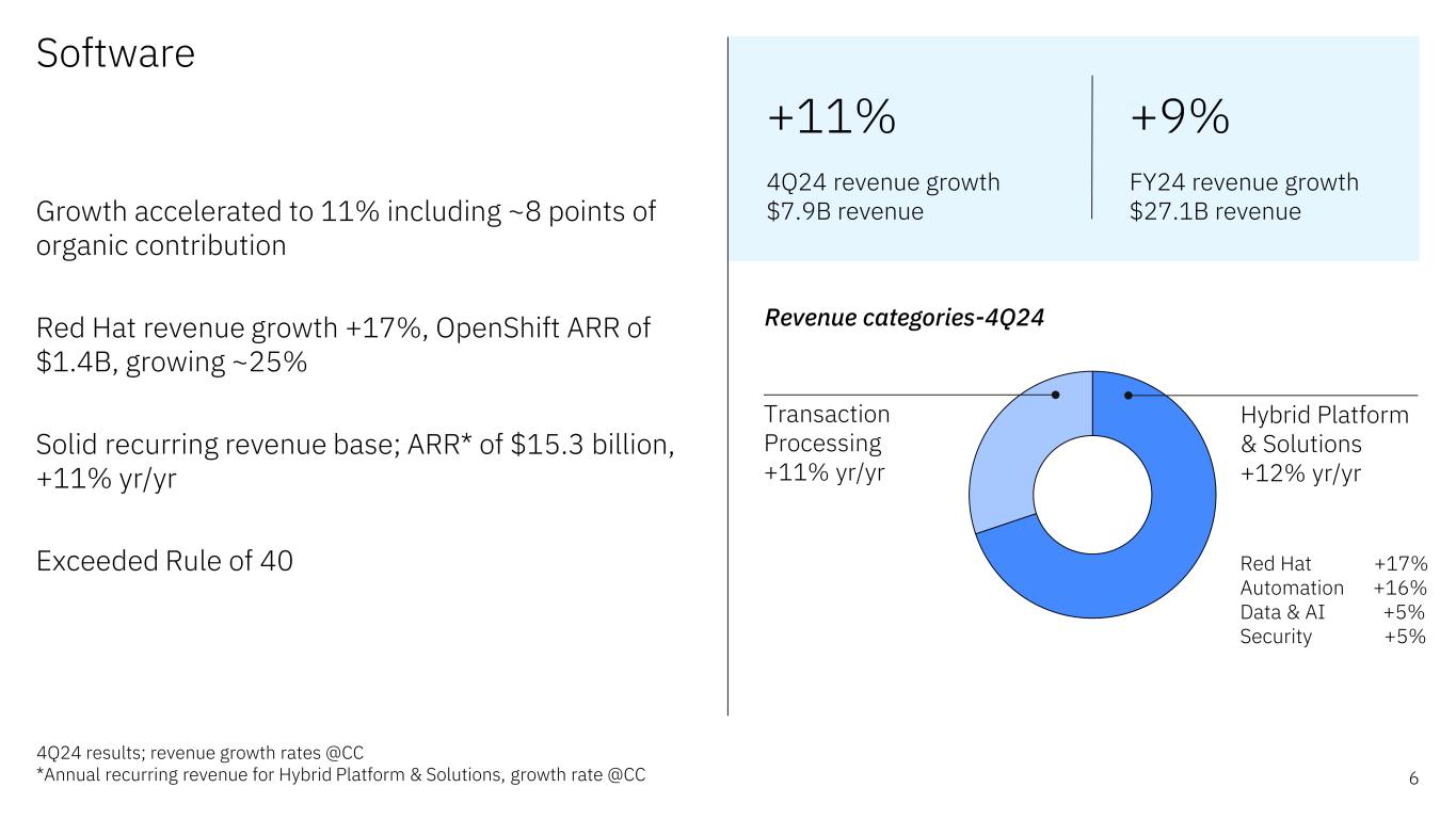 Financial highlights 5Revenue growth rates @CC $17.6B Revenue 2% growth $62.8B Revenue 3% growth 4Q24 $1.5B FY free cash flow yr/yr 120bps FY pre-tax margin expansion (operating) 7% FY diluted EPS growth (operating) $12.7B FY free cash flow 130bps FY gross margin expansion (operating) 9% FY pre-tax income growth (operating) FY24 “With strong performance across our Software portfolio, we continue to drive solid fundamentals within our business. As a result, we generated $12.7 billion in free cash flow, far- outpacing our expectation for the year. Continued strength in operating profitability and free cash flow fuels our ability to invest for the future while returning value to shareholders through dividends.” James Kavanaugh IBM SVP & CFO