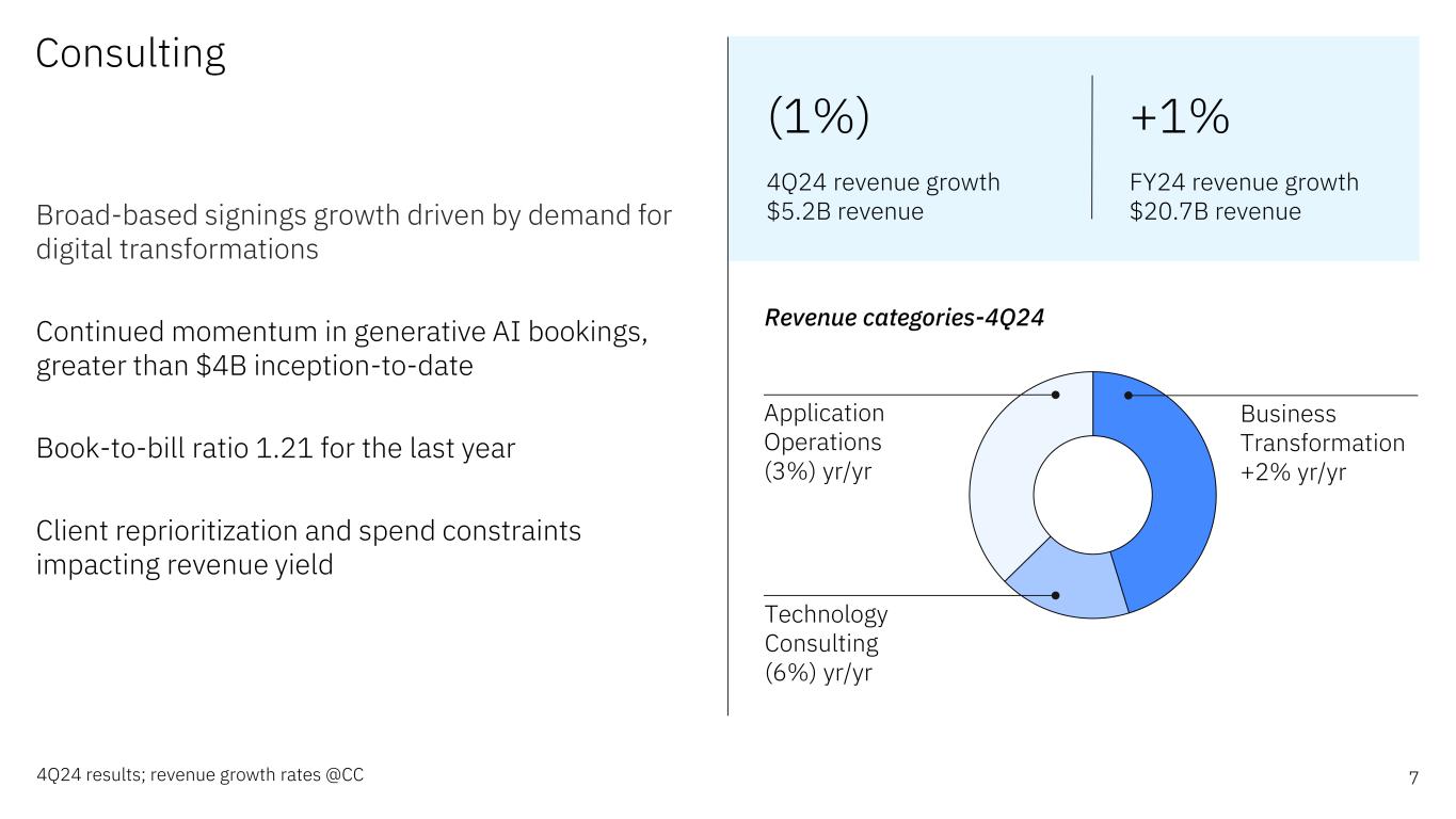 6 Revenue categories-4Q24 Red Hat +17% Automation +16% Data & AI +5% Security +5% Software 4Q24 results; revenue growth rates @CC *Annual recurring revenue for Hybrid Platform & Solutions, growth rate @CC Transaction Processing +11% yr/yr Hybrid Platform & Solutions +12% yr/yr Growth accelerated to 11% including ~8 points of organic contribution Red Hat revenue growth +17%, OpenShift ARR of $1.4B, growing ~25% Solid recurring revenue base; ARR* of $15.3 billion, +11% yr/yr Exceeded Rule of 40 +11% 4Q24 revenue growth $7.9B revenue +9% FY24 revenue growth $27.1B revenue