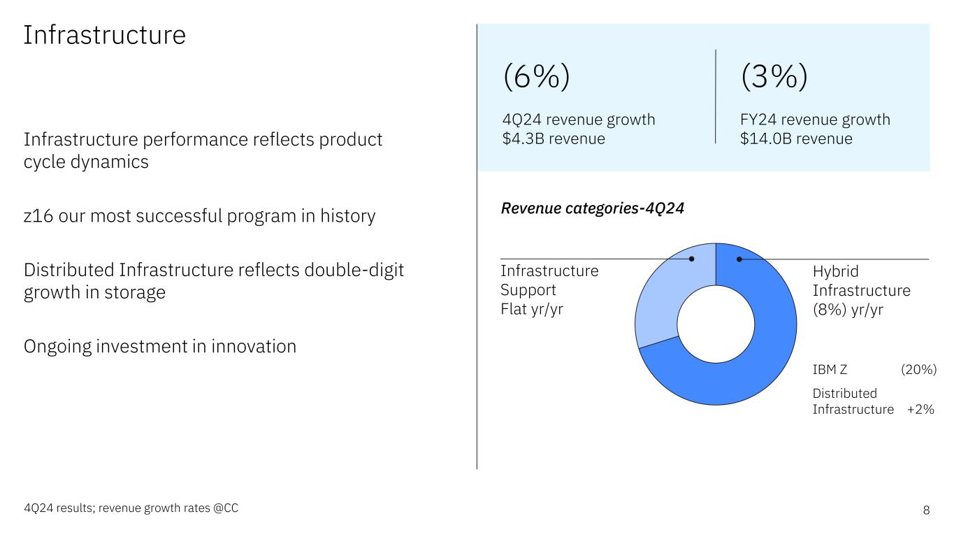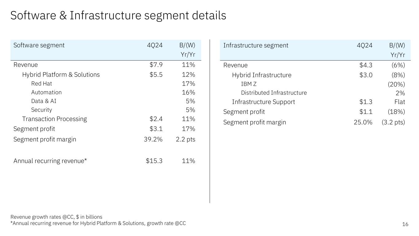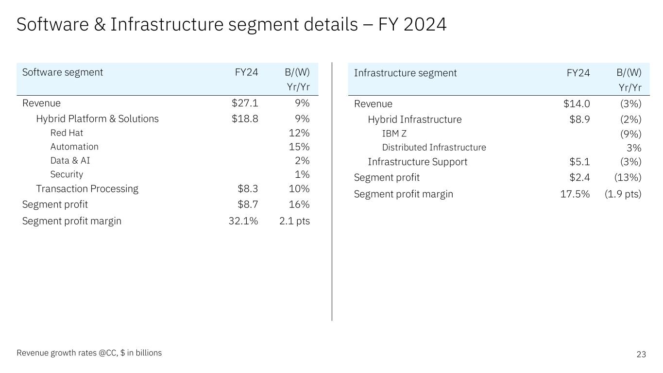 Software & Infrastructure segment details – FY 2024 23Revenue growth rates @CC, $ in billions Software segment FY24 B/(W) Yr/Yr Revenue $27.1 9% Hybrid Platform & Solutions $18.8 9% Red Hat 12% Automation 15% Data & AI 2% Security 1% Transaction Processing $8.3 10% Segment profit $8.7 16% Segment profit margin 32.1% 2.1 pts Infrastructure segment FY24 B/(W) Yr/Yr Revenue $14.0 (3%) Hybrid Infrastructure $8.9 (2%) IBM Z (9%) Distributed Infrastructure 3% Infrastructure Support $5.1 (3%) Segment profit $2.4 (13%) Segment profit margin 17.5% (1.9 pts)