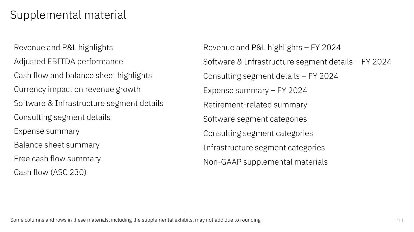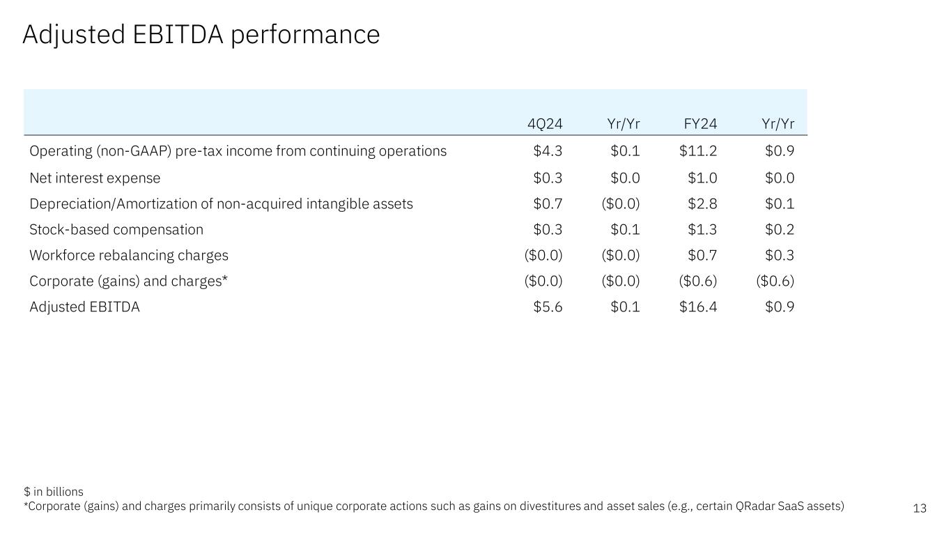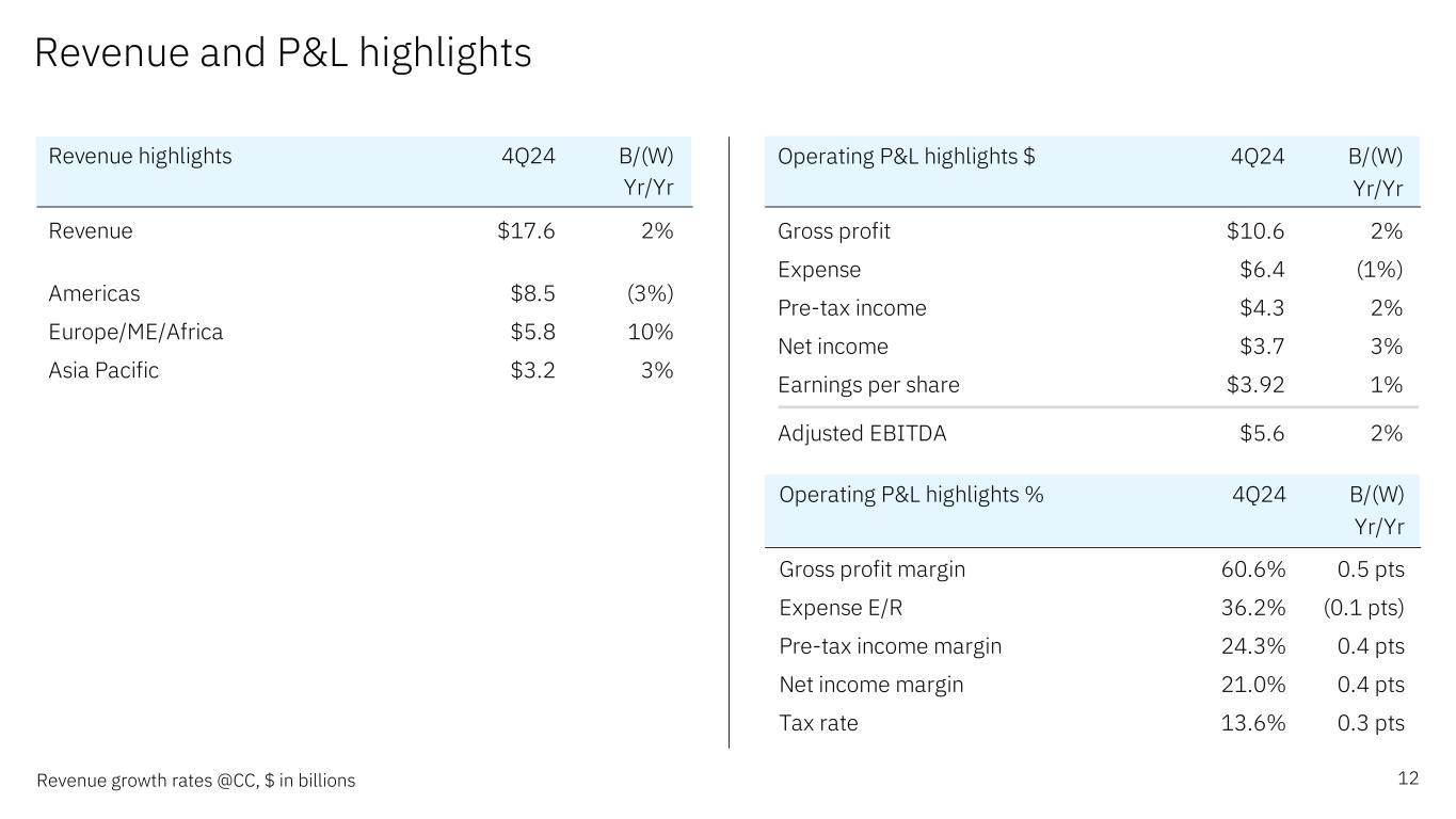 Supplemental material 11Some columns and rows in these materials, including the supplemental exhibits, may not add due to rounding Revenue and P&L highlights Adjusted EBITDA performance Cash flow and balance sheet highlights Currency impact on revenue growth Software & Infrastructure segment details Consulting segment details Expense summary Balance sheet summary Free cash flow summary Cash flow (ASC 230) Revenue and P&L highlights – FY 2024 Software & Infrastructure segment details – FY 2024 Consulting segment details – FY 2024 Expense summary – FY 2024 Retirement-related summary Software segment categories Consulting segment categories Infrastructure segment categories Non-GAAP supplemental materials