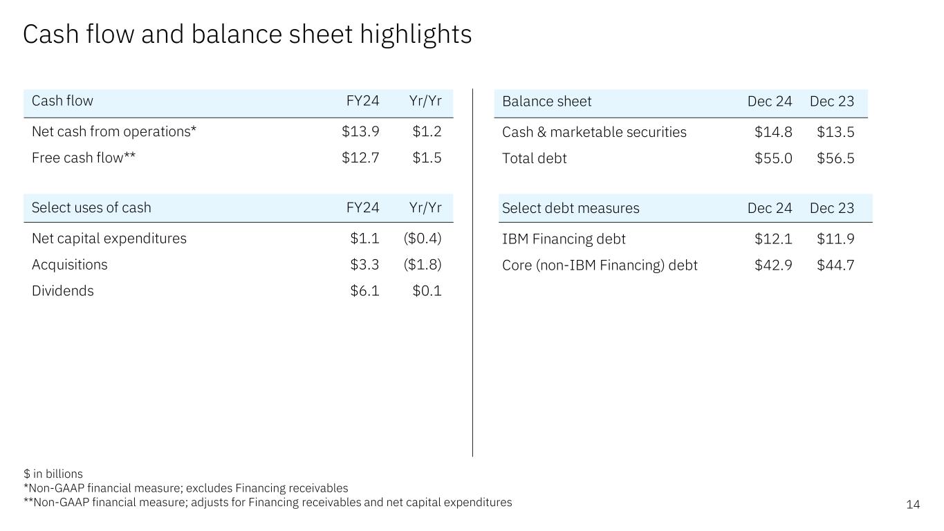 Adjusted EBITDA performance 13 $ in billions *Corporate (gains) and charges primarily consists of unique corporate actions such as gains on divestitures and asset sales (e.g., certain QRadar SaaS assets) 4Q24 Yr/Yr FY24 Yr/Yr Operating (non-GAAP) pre-tax income from continuing operations $4.3 $0.1 $11.2 $0.9 Net interest expense $0.3 $0.0 $1.0 $0.0 Depreciation/Amortization of non-acquired intangible assets $0.7 ($0.0) $2.8 $0.1 Stock-based compensation $0.3 $0.1 $1.3 $0.2 Workforce rebalancing charges ($0.0) ($0.0) $0.7 $0.3 Corporate (gains) and charges* ($0.0) ($0.0) ($0.6) ($0.6) Adjusted EBITDA $5.6 $0.1 $16.4 $0.9
