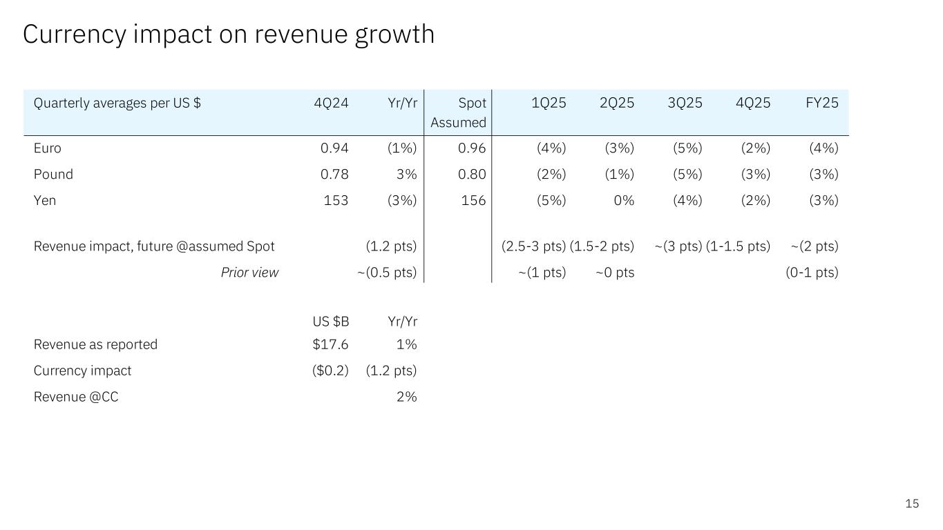 Cash flow and balance sheet highlights 14 $ in billions *Non-GAAP financial measure; excludes Financing receivables **Non-GAAP financial measure; adjusts for Financing receivables and net capital expenditures Balance sheet Dec 24 Dec 23 Cash & marketable securities $14.8 $13.5 Total debt $55.0 $56.5 Select debt measures Dec 24 Dec 23 IBM Financing debt $12.1 $11.9 Core (non-IBM Financing) debt $42.9 $44.7 Cash flow FY24 Yr/Yr Net cash from operations* $13.9 $1.2 Free cash flow** $12.7 $1.5 Select uses of cash FY24 Yr/Yr Net capital expenditures $1.1 ($0.4) Acquisitions $3.3 ($1.8) Dividends $6.1 $0.1
