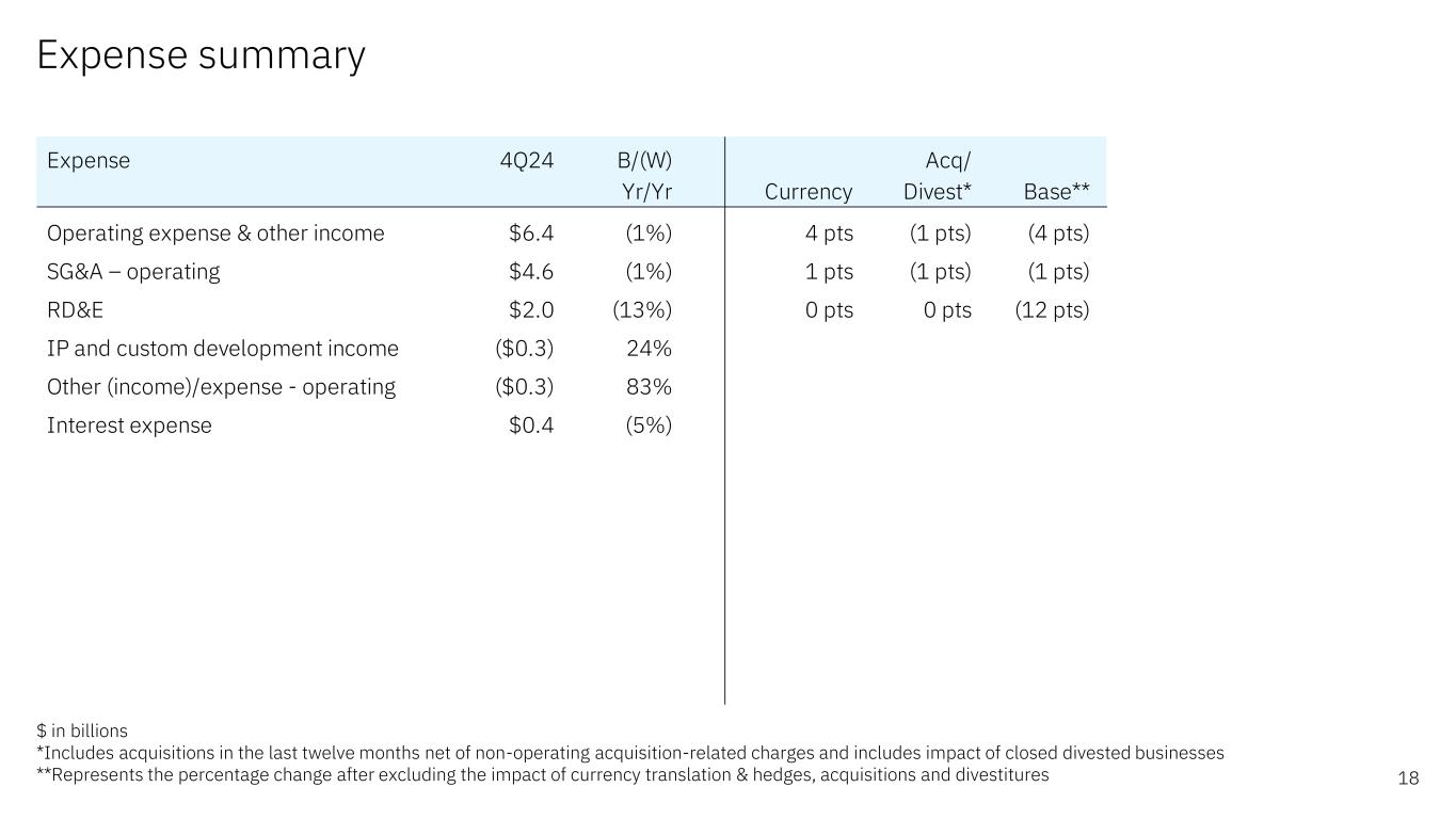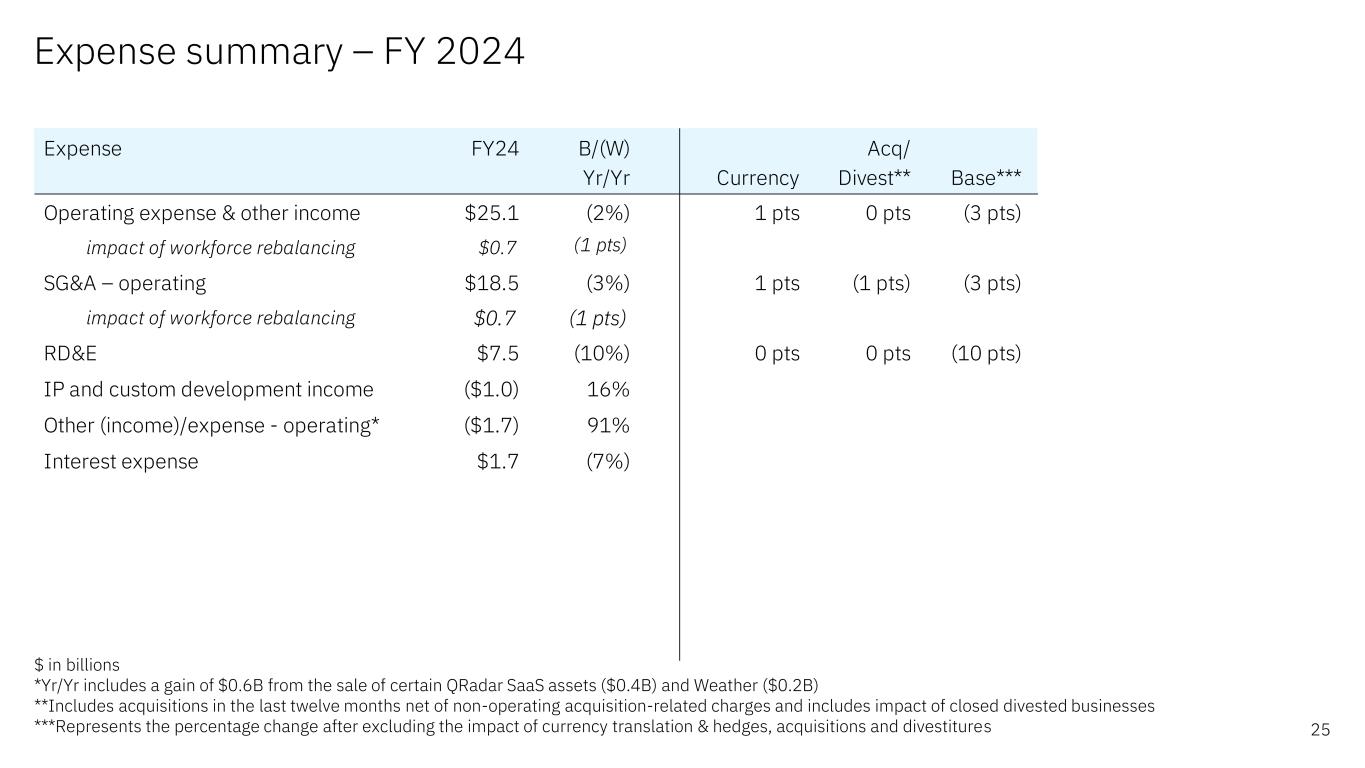Expense summary – FY 2024 25 $ in billions *Yr/Yr includes a gain of $0.6B from the sale of certain QRadar SaaS assets ($0.4B) and Weather ($0.2B) **Includes acquisitions in the last twelve months net of non-operating acquisition-related charges and includes impact of closed divested businesses ***Represents the percentage change after excluding the impact of currency translation & hedges, acquisitions and divestitures Expense FY24 B/(W) Acq/ Yr/Yr Currency Divest** Base*** Operating expense & other income $25.1 (2%) 1 pts 0 pts (3 pts) impact of workforce rebalancing $0.7 (1 pts) SG&A – operating $18.5 (3%) 1 pts (1 pts) (3 pts) impact of workforce rebalancing $0.7 (1 pts) RD&E $7.5 (10%) 0 pts 0 pts (10 pts) IP and custom development income ($1.0) 16% Other (income)/expense - operating* ($1.7) 91% Interest expense $1.7 (7%)