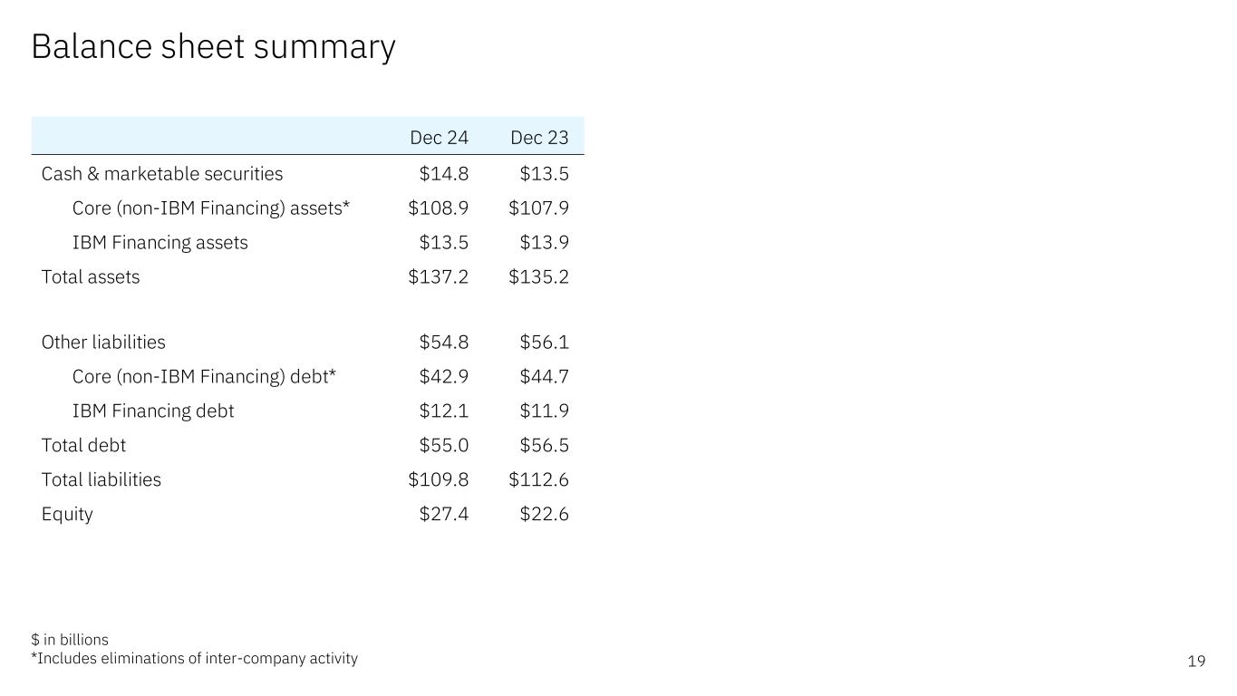 Balance sheet summary 19 $ in billions *Includes eliminations of inter-company activity Dec 24 Dec 23 Cash & marketable securities $14.8 $13.5 Core (non-IBM Financing) assets* $108.9 $107.9 IBM Financing assets $13.5 $13.9 Total assets $137.2 $135.2 Other liabilities $54.8 $56.1 Core (non-IBM Financing) debt* $42.9 $44.7 IBM Financing debt $12.1 $11.9 Total debt $55.0 $56.5 Total liabilities $109.8 $112.6 Equity $27.4 $22.6