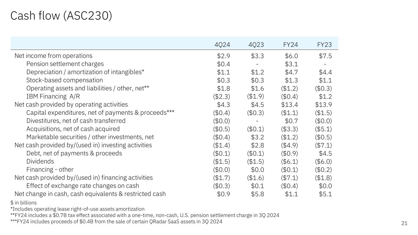 Free cash flow summary 20$ in billions B/(W) B/(W) 4Q24 Yr/Yr FY24 Yr/Yr Net cash from operations $4.3 ($0.1) $13.4 ($0.5) Less: IBM Financing receivables ($2.3) ($0.4) ($0.4) ($1.7) Net cash from operations (excluding IBM Financing receivables) $6.6 $0.2 $13.9 $1.2 Net capital expenditures ($0.4) ($0.2) ($1.1) $0.4 Free cash flow (excluding IBM Financing receivables) $6.2 $0.1 $12.7 $1.5