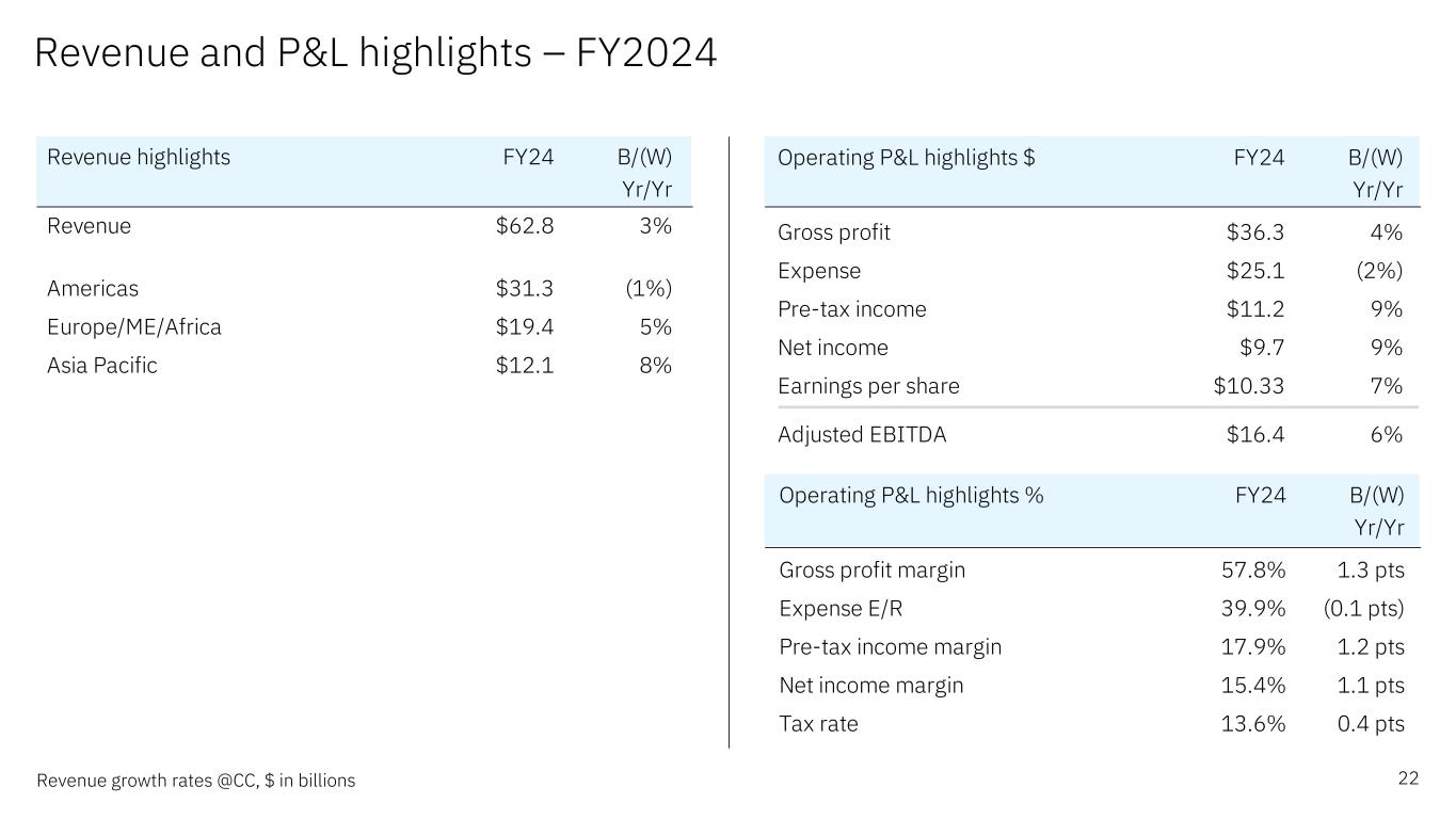 Cash flow (ASC230) 21 $ in billions *Includes operating lease right-of-use assets amortization **FY24 includes a $0.7B tax effect associated with a one-time, non-cash, U.S. pension settlement charge in 3Q 2024 ***FY24 includes proceeds of $0.4B from the sale of certain QRadar SaaS assets in 3Q 2024 4Q24 4Q23 FY24 FY23 Net income from operations $2.9 $3.3 $6.0 $7.5 Pension settlement charges $0.4 - $3.1 - Depreciation / amortization of intangibles* $1.1 $1.2 $4.7 $4.4 Stock-based compensation $0.3 $0.3 $1.3 $1.1 Operating assets and liabilities / other, net** $1.8 $1.6 ($1.2) ($0.3) IBM Financing A/R ($2.3) ($1.9) ($0.4) $1.2 Net cash provided by operating activities $4.3 $4.5 $13.4 $13.9 Capital expenditures, net of payments & proceeds*** ($0.4) ($0.3) ($1.1) ($1.5) Divestitures, net of cash transferred ($0.0) - $0.7 ($0.0) Acquisitions, net of cash acquired ($0.5) ($0.1) ($3.3) ($5.1) Marketable securities / other investments, net ($0.4) $3.2 ($1.2) ($0.5) Net cash provided by/(used in) investing activities ($1.4) $2.8 ($4.9) ($7.1) Debt, net of payments & proceeds ($0.1) ($0.1) ($0.9) $4.5 Dividends ($1.5) ($1.5) ($6.1) ($6.0) Financing - other ($0.0) $0.0 ($0.1) ($0.2) Net cash provided by/(used in) financing activities ($1.7) ($1.6) ($7.1) ($1.8) Effect of exchange rate changes on cash ($0.3) $0.1 ($0.4) $0.0 Net change in cash, cash equivalents & restricted cash $0.9 $5.8 $1.1 $5.1