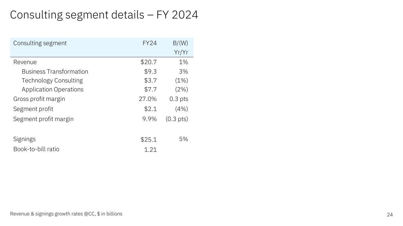 Consulting segment details – FY 2024 24Revenue & signings growth rates @CC, $ in billions Consulting segment FY24 B/(W) Yr/Yr Revenue $20.7 1% Business Transformation $9.3 3% Technology Consulting $3.7 (1%) Application Operations $7.7 (2%) Gross profit margin 27.0% 0.3 pts Segment profit $2.1 (4%) Segment profit margin 9.9% (0.3 pts) Signings $25.1 5% Book-to-bill ratio 1.21