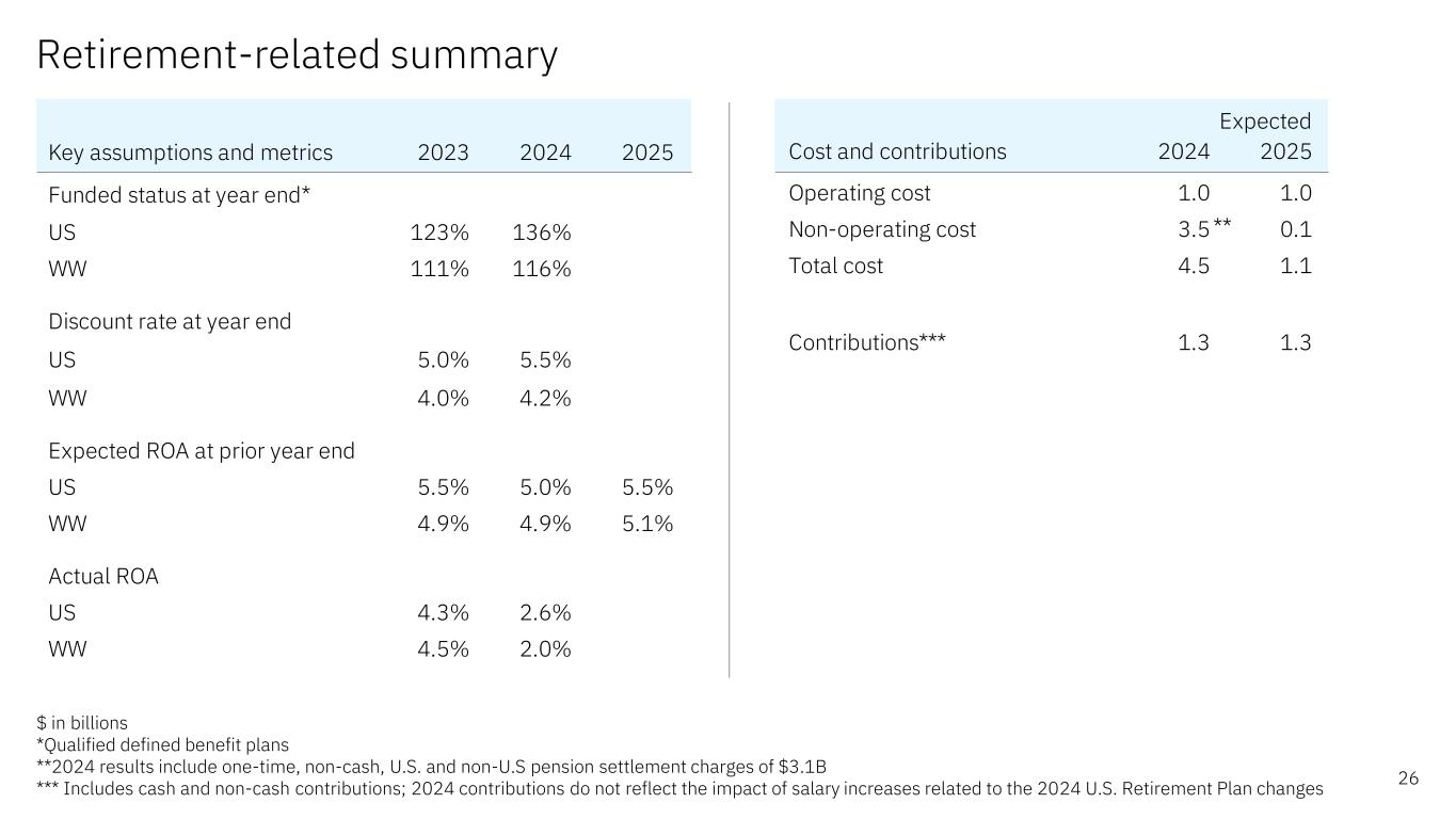 Retirement-related summary 26 $ in billions *Qualified defined benefit plans **2024 results include one-time, non-cash, U.S. and non-U.S pension settlement charges of $3.1B *** Includes cash and non-cash contributions; 2024 contributions do not reflect the impact of salary increases related to the 2024 U.S. Retirement Plan changes Key assumptions and metrics 2023 2024 2025 Funded status at year end* US 123% 136% WW 111% 116% Discount rate at year end US 5.0% 5.5% WW 4.0% 4.2% Expected ROA at prior year end US 5.5% 5.0% 5.5% WW 4.9% 4.9% 5.1% Actual ROA US 4.3% 2.6% WW 4.5% 2.0% Expected Cost and contributions 2024 2025 Operating cost 1.0 1.0 Non-operating cost 3.5 0.1 Total cost 4.5 1.1 Contributions*** 1.3 1.3 **