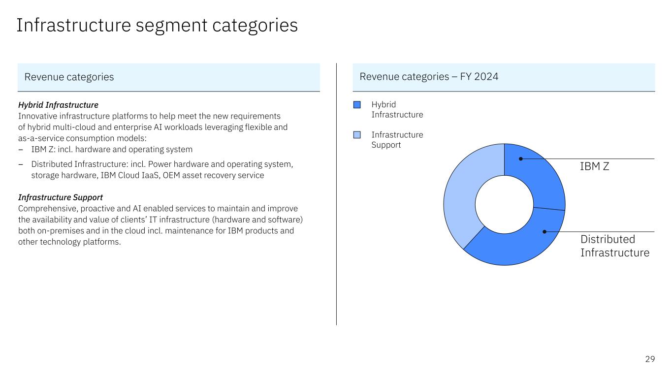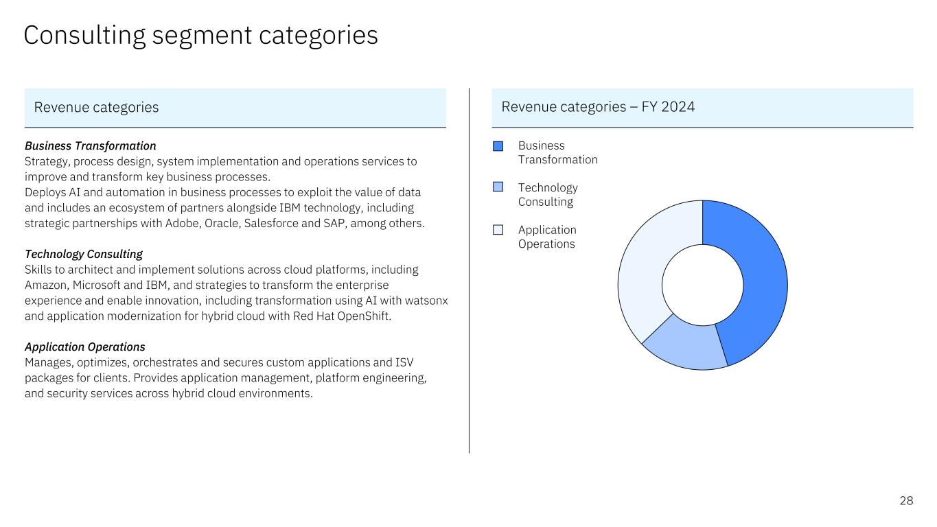 Business Transformation Technology Consulting Application Operations Consulting segment categories Business Transformation Strategy, process design, system implementation and operations services to improve and transform key business processes. Deploys AI and automation in business processes to exploit the value of data and includes an ecosystem of partners alongside IBM technology, including strategic partnerships with Adobe, Oracle, Salesforce and SAP, among others. Technology Consulting Skills to architect and implement solutions across cloud platforms, including Amazon, Microsoft and IBM, and strategies to transform the enterprise experience and enable innovation, including transformation using AI with watsonx and application modernization for hybrid cloud with Red Hat OpenShift. Application Operations Manages, optimizes, orchestrates and secures custom applications and ISV packages for clients. Provides application management, platform engineering, and security services across hybrid cloud environments. Revenue categories – FY 2024 28 Revenue categories