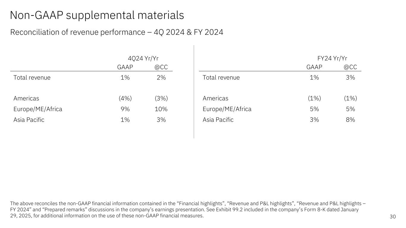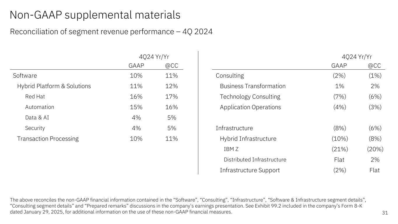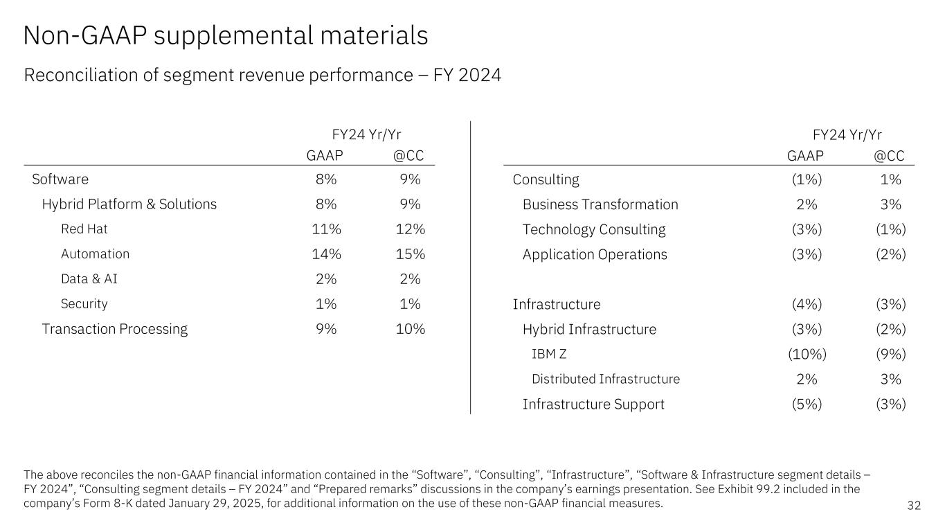 GAAP @CC Software 10% 11% Hybrid Platform & Solutions 11% 12% Red Hat 16% 17% Automation 15% 16% Data & AI 4% 5% Security 4% 5% Transaction Processing 10% 11% 4Q24 Yr/Yr GAAP @CC Consulting (2%) (1%) Business Transformation 1% 2% Technology Consulting (7%) (6%) Application Operations (4%) (3%) Infrastructure (8%) (6%) Hybrid Infrastructure (10%) (8%) IBM Z (21%) (20%) Distributed Infrastructure Flat 2% Infrastructure Support (2%) Flat 4Q24 Yr/Yr Non-GAAP supplemental materials Reconciliation of segment revenue performance – 4Q 2024 31 The above reconciles the non-GAAP financial information contained in the “Software”, “Consulting”, “Infrastructure”, “Software & Infrastructure segment details”, “Consulting segment details” and “Prepared remarks” discussions in the company’s earnings presentation. See Exhibit 99.2 included in the company’s Form 8-K dated January 29, 2025, for additional information on the use of these non-GAAP financial measures.