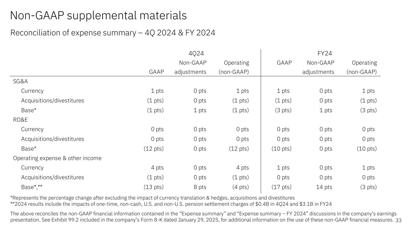 Non-GAAP supplemental materials Reconciliation of segment revenue performance – FY 2024 32 The above reconciles the non-GAAP financial information contained in the “Software”, “Consulting”, “Infrastructure”, “Software & Infrastructure segment details – FY 2024”, “Consulting segment details – FY 2024” and “Prepared remarks” discussions in the company’s earnings presentation. See Exhibit 99.2 included in the company’s Form 8-K dated January 29, 2025, for additional information on the use of these non-GAAP financial measures. GAAP @CC Software 8% 9% Hybrid Platform & Solutions 8% 9% Red Hat 11% 12% Automation 14% 15% Data & AI 2% 2% Security 1% 1% Transaction Processing 9% 10% FY24 Yr/Yr GAAP @CC Consulting (1%) 1% Business Transformation 2% 3% Technology Consulting (3%) (1%) Application Operations (3%) (2%) Infrastructure (4%) (3%) Hybrid Infrastructure (3%) (2%) IBM Z (10%) (9%) Distributed Infrastructure 2% 3% Infrastructure Support (5%) (3%) FY24 Yr/Yr