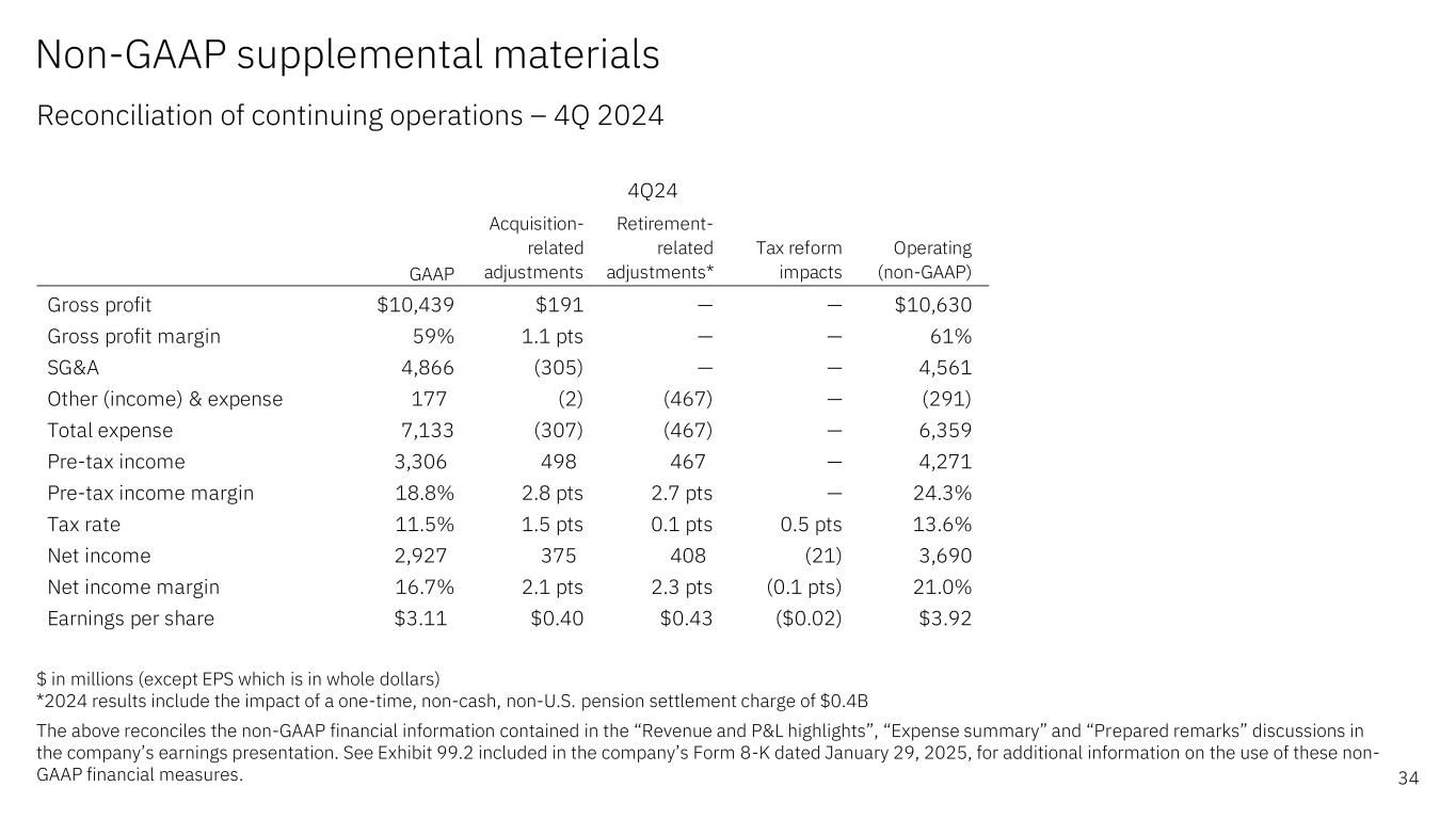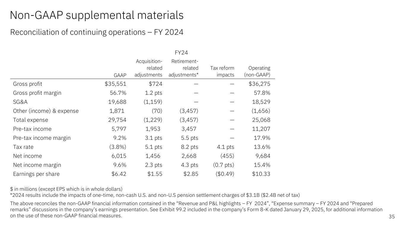 Non-GAAP supplemental materials Reconciliation of continuing operations – 4Q 2024 34 $ in millions (except EPS which is in whole dollars) *2024 results include the impact of a one-time, non-cash, non-U.S. pension settlement charge of $0.4B The above reconciles the non-GAAP financial information contained in the “Revenue and P&L highlights”, “Expense summary” and “Prepared remarks” discussions in the company’s earnings presentation. See Exhibit 99.2 included in the company’s Form 8-K dated January 29, 2025, for additional information on the use of these non- GAAP financial measures. GAAP Acquisition- related adjustments Retirement- related adjustments* Tax reform impacts Operating (non-GAAP) Gross profit $10,439 $191 — — $10,630 Gross profit margin 59% 1.1 pts — — 61% SG&A 4,866 (305) — — 4,561 Other (income) & expense 177 (2) (467) — (291) Total expense  7,133 (307) (467) — 6,359 Pre-tax income 3,306 498 467 — 4,271 Pre-tax income margin 18.8% 2.8 pts 2.7 pts — 24.3% Tax rate 11.5% 1.5 pts 0.1 pts 0.5 pts 13.6% Net income 2,927 375 408 (21) 3,690 Net income margin 16.7% 2.1 pts 2.3 pts (0.1 pts) 21.0% Earnings per share $3.11 $0.40 $0.43 ($0.02) $3.92 4Q24
