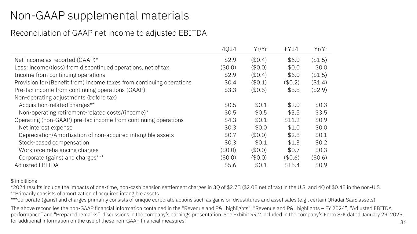 Non-GAAP supplemental materials Reconciliation of continuing operations – FY 2024 35 $ in millions (except EPS which is in whole dollars) *2024 results include the impacts of one-time, non-cash U.S. and non-U.S pension settlement charges of $3.1B ($2.4B net of tax) The above reconciles the non-GAAP financial information contained in the “Revenue and P&L highlights – FY 2024”, “Expense summary – FY 2024 and “Prepared remarks” discussions in the company’s earnings presentation. See Exhibit 99.2 included in the company’s Form 8-K dated January 29, 2025, for additional information on the use of these non-GAAP financial measures. GAAP Acquisition- related adjustments Retirement- related adjustments* Tax reform impacts Operating (non-GAAP) Gross profit $35,551 $724 — — $36,275 Gross profit margin 56.7% 1.2 pts — — 57.8% SG&A 19,688 (1,159) — — 18,529 Other (income) & expense 1,871 (70) (3,457) — (1,656) Total expense  29,754 (1,229) (3,457) — 25,068 Pre-tax income 5,797 1,953 3,457 — 11,207 Pre-tax income margin 9.2% 3.1 pts 5.5 pts — 17.9% Tax rate (3.8%) 5.1 pts 8.2 pts 4.1 pts 13.6% Net income 6,015 1,456 2,668 (455) 9,684 Net income margin 9.6% 2.3 pts 4.3 pts (0.7 pts) 15.4% Earnings per share $6.42 $1.55 $2.85 ($0.49) $10.33 FY24