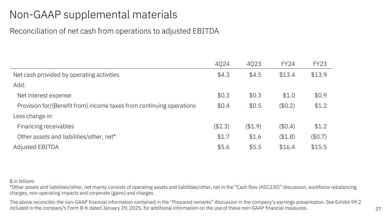 4Q24 Yr/Yr FY24 Yr/Yr Net income as reported (GAAP)* $2.9 ($0.4) $6.0 ($1.5) Less: income/(loss) from discontinued operations, net of tax ($0.0) ($0.0) $0.0 $0.0 Income from continuing operations $2.9 ($0.4) $6.0 ($1.5) Provision for/(Benefit from) income taxes from continuing operations $0.4 ($0.1) ($0.2) ($1.4) Pre-tax income from continuing operations (GAAP) $3.3 ($0.5) $5.8 ($2.9) Non-operating adjustments (before tax) Acquisition-related charges** $0.5 $0.1 $2.0 $0.3 Non-operating retirement-related costs/(income)* $0.5 $0.5 $3.5 $3.5 Operating (non-GAAP) pre-tax income from continuing operations $4.3 $0.1 $11.2 $0.9 Net interest expense $0.3 $0.0 $1.0 $0.0 Depreciation/Amortization of non-acquired intangible assets $0.7 ($0.0) $2.8 $0.1 Stock-based compensation $0.3 $0.1 $1.3 $0.2 Workforce rebalancing charges ($0.0) ($0.0) $0.7 $0.3 Corporate (gains) and charges*** ($0.0) ($0.0) ($0.6) ($0.6) Adjusted EBITDA $5.6 $0.1 $16.4 $0.9 Non-GAAP supplemental materials Reconciliation of GAAP net income to adjusted EBITDA 36 $ in billions *2024 results include the impacts of one-time, non-cash pension settlement charges in 3Q of $2.7B ($2.0B net of tax) in the U.S. and 4Q of $0.4B in the non-U.S. **Primarily consists of amortization of acquired intangible assets ***Corporate (gains) and charges primarily consists of unique corporate actions such as gains on divestitures and asset sales (e.g., certain QRadar SaaS assets) The above reconciles the non-GAAP financial information contained in the “Revenue and P&L highlights", “Revenue and P&L highlights – FY 2024”, “Adjusted EBITDA performance” and "Prepared remarks” discussions in the company’s earnings presentation. See Exhibit 99.2 included in the company’s Form 8-K dated January 29, 2025, for additional information on the use of these non-GAAP financial measures.